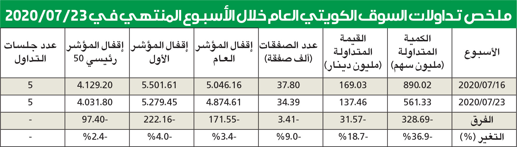 وفي المقابل، كانت أكبر الخسائر في مؤشر بورصة الكويت، الذي فقد نسبة كبيرة بلغت 3.4 في المئة على مستوى مؤشر السوق العام، إذ نزف 171.55 نقطة، ليقفل على مستوى 4874.61 نقطة، مواصلا أداءً سلبيا، بدأه منتصف الأسبوع الثاني من يوليو، وكان الضغط من الأسهم القيادية التي خسرت 4 في المئة، إذ تراجع مؤشر السوق الأول 222.16 نقطة ليقفل على مستوى 5279.45 نقطة، كما خسر مؤشر رئيسي 50، وهو مؤشر اكبر 50 شركة وأكثرها نشاطا في السوق الرئيسي نسبة 2.4 في المئة، أي 97.4 نقطة ليقفل على مستوى 4031.8 نقطة.واستمرت الشركات المدرجة بحجب بياناتها للربعين الأول والثاني، ولم يظهر منها سوى شركتي الاتصالات زين واوريدو، وكانا بتراجع متفاوت، حيث كان مقبولا في "زين" وكبيرا جدا في اوريدو، وتراجع النشاط والسيولة خلال الأسبوع الماضي مقارنة بما سبقه بنسبة 18.7 و37 في المئة على التوالي، كما خسر عدد الصفقات 9 في المئة، وتتجه الأنظار بترقب كبير لنتائج المصارف خلال الأسبوع المقبل، والتي ستفتح الباب لتقييم جديد للأسعار في سوق الأسهم الكويتي الذي يجهل بينات ربعين متتالين حتى نهاية الأسبوع الماضي. وسجل مؤشر سوق البحرين تراجعا واضحا وسطا بنسبة 1.4 في المئة، حيث خسر 17.84 نقطة ليقفل على مستوى 1284.64 نقطة، ولم تمهل موجة البيع الشمولية في بورصة الكويت سهم الأهلي المتحد البحريني من التخلص من الاتجاه الهابط وبداية الانعكاس، الذي بدوره يؤثر إيجابا على أداء مؤشر سوق البحرين المالي.واستقر مؤشر سوقي الامارات الماليين على خسائر محدودة، وبعد ان تذبذب أداؤهما خلال فترة شهرين ماضيين تقريبا، وأقفل مؤشر ابوظبي على خسارة ثلث نقطة مئوية تساوي 13.39 نقطة، ليقفل على مستوى 4261.07 نقطة، بينما استقر مؤشر دبي بتغير لا يكاد يذكر بـ 0.02 نقطة، ليبقى حول مستواه السابق على 2052.65 نقطة، ولكنه مال إلى المنطقة الحمراء على عكس مؤشر السوق السعودي الذي تغير بنفس الجزء من النقاط، ولكن باللون الأخضر.