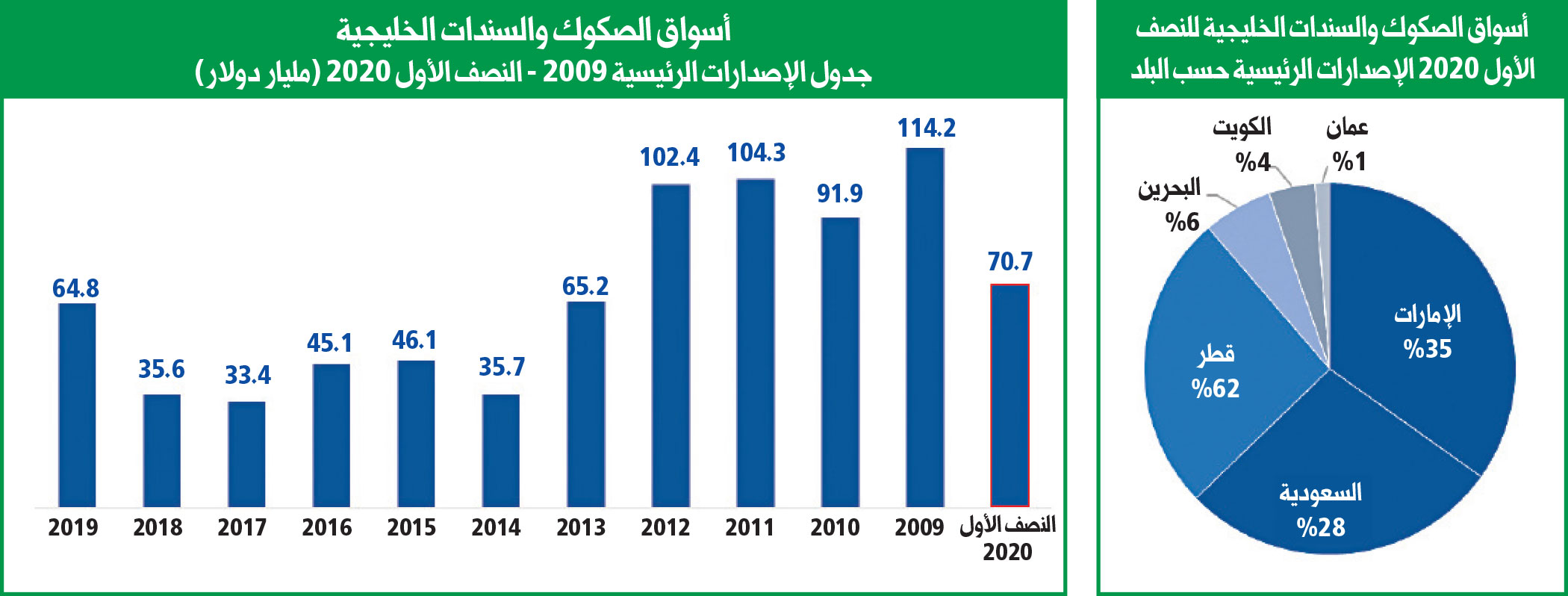 تصدّرت الإمارات العربية المتحدة إجمالي إصدارات سوق السندات والصكوك الخليجية في النصف الأول من 2020 بقيمة إجمالية بلغت 24.6 مليار دولار أو 35 في المئة من إجمالي قيمة الإصدارات الخليجية من خلال 95 إصداراً. تلهتا السعودية بنسبة 28 في المئة من إجمالي قيمة الإصدارات الخليجية، وجاءت قطر في المركز الثالث بنسبة 26 في المئة من إجمالي قيمة الإصدارات الخليجية، في حين بلغت حصة الإصدارات الكويتية 2.8 مليار دولار أو 4 في المئة من إجمالي قيمة الإصدارات الخليجية.الإصدارات السيادية مقابل إصدارات الشركات