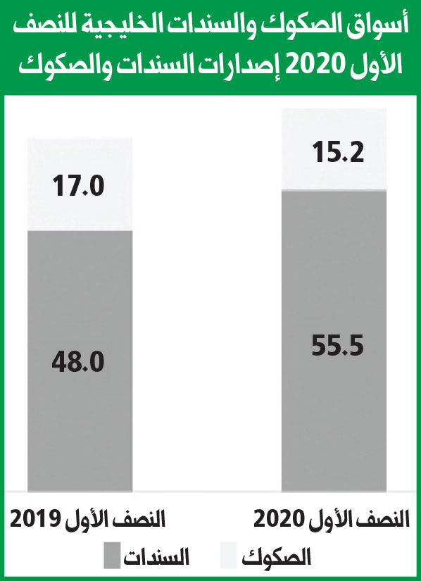 وخلال النصف الأول من 2020، بلغت الإصدارات الأولوية السيادية الخليجية 42.3 مليار دولار، بارتفاع قدره 40 في المئة على أساس سنوي، مقارنة بإجمالي إصدارات بقيمة 30.1 ملياراً خلال النصف الأول من 2019. كما بلغت إصدارات الشركات 28.5 مليار دولار خلال النصف الأول من 2020 بانخفاض قدره 18 في المئة على أساس سنوي مقارنة بإجمالي إصدارات بقيمة 34.9 مليار دولار خلال النصف الأول من 2019.السندات التقليدية مقابل الصكوك