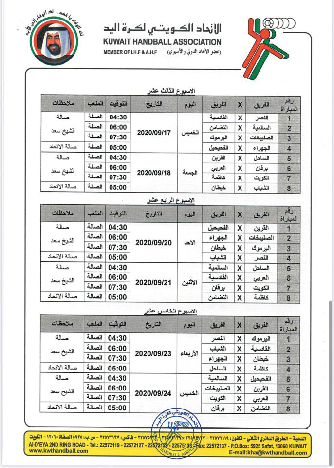 أصدرت لجنة المسابقات في اتحاد كرة اليد جدول المباريات المتبقية من القسم الأول لبطولة الدوري العام (الدمج) للموسم الحالي (2019-2020)، بحيث تستأنف المباريات مطلع سبتمبر المقبل بمباراتي الساحل مع العربي، والكويت مع التضامن، على صالة الشيخ سعد العبدالله بصباح السالم.وتستمر مباريات الدور الأول من بطولة الدوري حتى 24 من نفس الشهر، بعدها سيتم تحديد مواعيد الدوري الممتاز (الستة الكبار) والدرجة الأولى، على أن يختتم الموسم الحالي ببطولة كأس الاتحاد، وسيتحدد موعدهما في وقت لاحق.