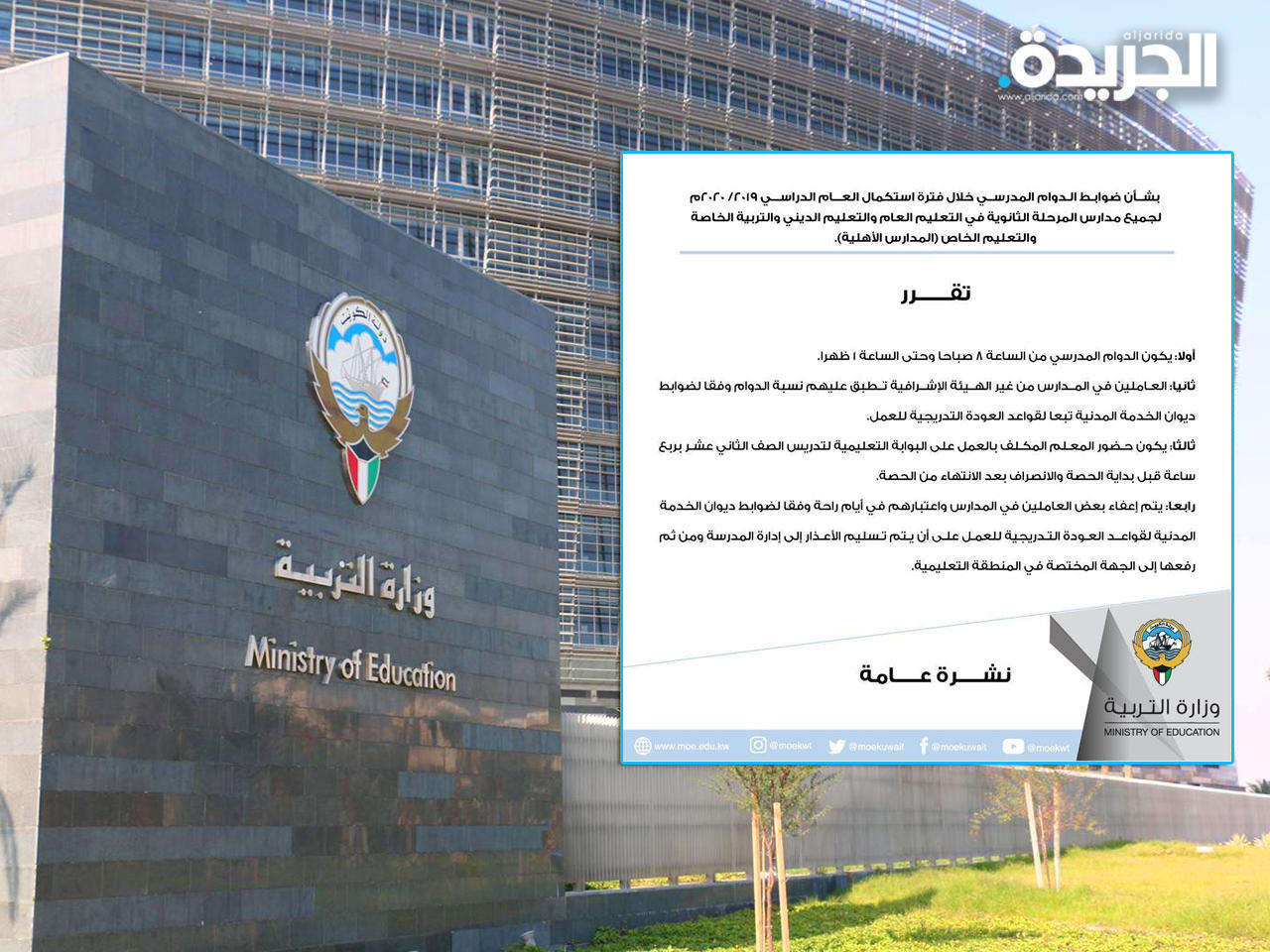 وأضافت التربية في نشرتها، العاملين من غير الهيئات الاشرافية ستطبق عليهم نسبة الدوام وفقاً للضوابط التي وضعها ديوان الخدمة المدنية وتبعاً لقواعد العودة التدريجية للعمل.وأشارت إلى أن حضور المعلم يكون قبل بدء الحصة المكلف بها للعمل على البوابة التعليمية لتدريس الصف الثاني عشر بربع ساعة من موعد بدء الحصة والانصراف بعدها مباشرة، منوهة إلى أنه سيتم اعفاء بعض العاملين وفقاً للضوابط التي وضعها ديوان الخدمة المدنية على أن تسلم الأعذار الطبية إلى الادارات المدرسية وترفع إلى الجهات المختصة بالمناطق التعليمية.
