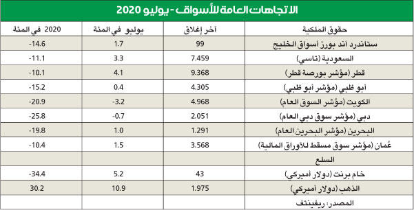 وعلى الصعيد الإقليمي، أشار تقرير «المركز» إلى أن مؤشر ستاندرد آند بورز المُركّب لدول مجلس التعاون الخليجي حقق مكاسب بنسبة 1.7 في المئة، فيما أعلنت جميع الأسواق، باستثناء الكويت ودبي عن تحقيق أرباح. وارتفع مؤشر بورصة قطر بنسبة 4.1 في المئة في يوليو تليه سوقي السعودية وعمان اللذان ارتفعا بنسبة 3.3 في المئة و1.5 في المئة على التوالي. وحفزت اتفاقية «أوبك بلس» لخفض الإنتاج بمقدار 7.7 ملايين برميل يومياً ابتداءً من أغسطس المستثمرين في الدول الخليجية. ووفقاً لوكالة ستاندرد آند بورز، من المقرر أن ينخفض الناتج المحلي الإجمالي لدبي بنسبة 11 في المئة في السنة المالية 2020. وتتوقع وكالة موديز أن الإيجارات ومبيعات المنازل ستنخفض في الإمارات، وخصوصاً في دبي، على مدار 12 إلى 18 شهراً. وسجلت السعودية عجزاً قدره 29.12 مليار دولار في الربع الثاني من السنة المالية 2020، فيما تراجعت عائدات النفط بنسبة 45 في المئة على أساس سنوي. كما انخفض إجمالي الإيرادات بنسبة 49 في المئة. وعلى إثر زيادة السعودية لضريبة القيمة المضافة بمقدار ثلاثة أضعاف اعتباراً من 1 يوليو 2020، توقع صندوق النقد الدولي أنه قد لا يكون الوقت المناسب لفرض ضرائب جديدة في دول مجلس التعاون الخليجي. وأشار تقرير «المركز» إلى أن شركة أبوظبي الوطنية للطاقة (أبوظبي) ومجموعة إزدان القابضة (قطر) كانتا من أفضل الشركات القيادية أداءً في دول مجلس التعاون الخليجي، إذ حققتا أرباحاً هائلة في شهر يوليو بارتفاع بنسبة 94 في المئة و25 في المئة على التوالي، فيما ارتفع سعر سهم شركة أبوظبي الوطنية للطاقة، مدفوعاً بإنجاز الشركة لاتفاقية تطوير مشروع الفجيرة F3 للطاقة بقيمة 1.14 مليار دولار.وسادت حالة من الإيجابية في أداء أسواق الأسهم العالمية، مدفوعة بتدفق السيولة من قبل البنوك المركزية وتوصل زعماء الاتحاد الأوروبي لاتفاق بخصوص صفقة ضخمة للتعافي من آثار فيروس كورونا، إضافة إلى ارتفاع مؤشر MSCI العالمي بنسبة 4.7 في المئة في شهر يوليو. وارتفعت الأسهم الأميركية (إس أند بي 500) بنسبة 5.5 في المئة في شهر يوليو ماحية خسائرها على أساس سنوي حتى تاريخه. وجاءت المكاسب مدعومة بتقارير عن نمو أرباح أسهم شركات ذات قيمة سوقية هائلة تعمل في مجال التكنولوجيا المتقدمة، وسط التهديدات المتمثلة في الزيادة في الحالات بما يتسبب في انتكاسات بإعادة فتح الاقتصاد. وسجل مؤشر أسواق المملكة المتحدة (مؤشر فوتسي 100) خسارة بنسبة 4.4 في المئة للشهر. كما شهدت الأسواق الناشئة معاملات شراء ضخمة، حيث ارتفعت بنسبة 8.4 في المئة لهذا الشهر.وأغلقت أسعار النفط عند حاجز 43.3 دولاراً للبرميل في نهاية شهر يوليو 2020. ويترجم ذلك إلى مكاسب شهرية بنسبة 5.2 في المئة، على خلفية تخفيضات الإنتاج وتخفيف قيود الإغلاق. وبلغت نسبة الامتثال لاتفاقية «أوبك بلس» لخفض إنتاج النفط المتفق عليها نسبة 107 في المئة في شهر يونيو. ووفقاً لوكالة الطاقة الدولية، هبط إنتاج الولايات المتحدة من النفط الخام في مايو، بمقدار غير مسبوق بلغ مليوني برميل يومياً. وواصلت أسعار الذهب ارتفاعها بنسبة 10.9 في المئة في شهر يوليو.