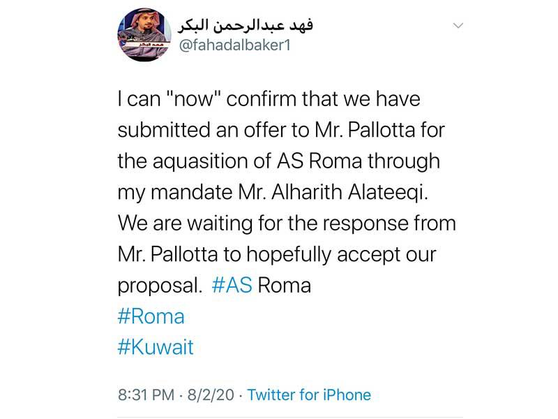 كشف رجل الأعمال الكويتي فهد البكر، أن شركة وينرز التجارية العالمية قدمت عرضاً رسمياً للاستحواذ على نادي روما الإيطالي.ونشر البكر، أمس الأول، عبر حسابه بموقع التواصل الاجتماعي، تغريدة باللغة الإنكليزية جاء فيها: "يمكنني الآن التأكيد على أننا تقدمنا بعرض لشراء نادي روما إلى السيد بالوتا رئيس النادي، وذلك عبر المفوض الحارث العتيقي. ننتظر رد السيد بالوتا على أمل أن يوافق على عرضنا".وكانت "الجريدة" نشرت خبراً عن رغبة شركة وينرز الكويتية في الدخول بشراكة خليجية من أجل شراء النادي الأسبوع الماضي، في الوقت الذي أبدى فيه فهد البكر تحفظه بخصوص الإشارة إلى اسم النادي الإيطالي المعني، وذلك بسبب احتمال تأثير تلك الأخبار على حقوق المساهمين، إذ إن "الجيالوروسي" أحد ثلاثة أندية مدرجة بالبورصة الإيطالية، إلا أن تغريدة البكر، أمس الأول، كانت أكثر جرأة بعد ما جهر باسم نادي روما، الأمر الذي استدعى رداً سريعاً من السيد جيمس بالوتا رئيس النادي، والذي عاد بدوره لنفي الخبر للمرة الثانية، من خلال تصريح لموقع "روما بريس"، إذ قال: "لا غير صحيح، لم نحصل على أي عرض من الكويت، سيكون لدي قصة كبيرة للقراءة والتسلية بعد أن تنتهي هذه الحكاية".ومن الواضح أن جيمس بالوتا مازال يرغب في بيع النادي لرجل الأعمال الأميركي دان فريدكن، الذي سبق له التقدم بعرض بلغ 490 مليون يورو، بالإضافة الى 85 مليون يورو فورية من أجل دعم ميزانية النادي في سوق الانتقالات، بينما كان العرض السابق يبلغ 455 مليون يورو، والذي تم رفضه من إدارة "الجيالوروسي".