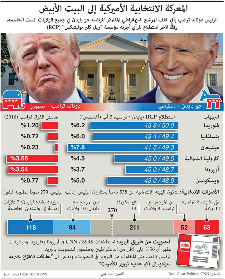 إلى ذلك، أعلن وزير الخارجية مايك بومبيو أنه سيتم تقديم مكافأة تصل إلى 10 ملايين دولار لمن يساهم بمعلومات تسمح بالتعرف أو تحديد مكان أي شخص يتدخل في الانتخابات بناء على توجيهات حكومة أجنبية أو تحت قيادتها، داعياً أي أميركي بحوزته معلومات حول تدخلات خارجية «من خلال أنشطة سيبرانية غير قانونية»، إلى أن يتواصل مع الحكومة أو أقرب سفارة.وكشف بومبيو عن «إطلاق 5 خطوط جديدة في إطار برنامج الشبكة النظيفة لإدارة ترامب الهادف لحماية البنية التحتية الأساسية للاتصالات والتكنولوجيا وخصوصية المواطنين والمعلومات الأكثر حساسية للشركات من عمليات الاقتحام العدوانية من الجهات الخبيثة مثل الحزب الشيوعي الصيني».وفي خطوة خارجة عن التقليد، أعلن ترامب أنه يدرس إمكان إلقاء خطاب قبوله ترشحه للانتخابات عن الحزب الجمهوري من البيت الأبيض، وذلك بعد أن وجه تفشي وباء كورونا ضربة جديدة لحملته وحملة منافسه الديمقراطي جو بايدن.وأكد الحزب الديمقراطي أن بايدن «لن يسافر بعد ذلك إلى ميلووكي وسيخاطب الأمة بدلاً من ذلك مدة ساعتين كل ليلة من 17 إلى 20 أغسطس، وسيقبل ترشيحه من ولاية ديلاوير التي يقيم بها». وفي رسالة لهيئة إدارة المناظرات، طلبت حملة ترامب، أمس الأول، تنظيم مناظرة إضافية أمام بايدن، معتبرة أن «النهج الحالي للجنة عفا عليه الزمن ولا يعكس حقائق التصويت في عام 2020».ومن المقرر إجراء المناظرة الأولى في 29 سبتمبر، لكن في بعض الولايات يمكن للأشخاص الإدلاء بأصواتهم بالبريد قبل أسابيع من المناظرة المتلفزة.