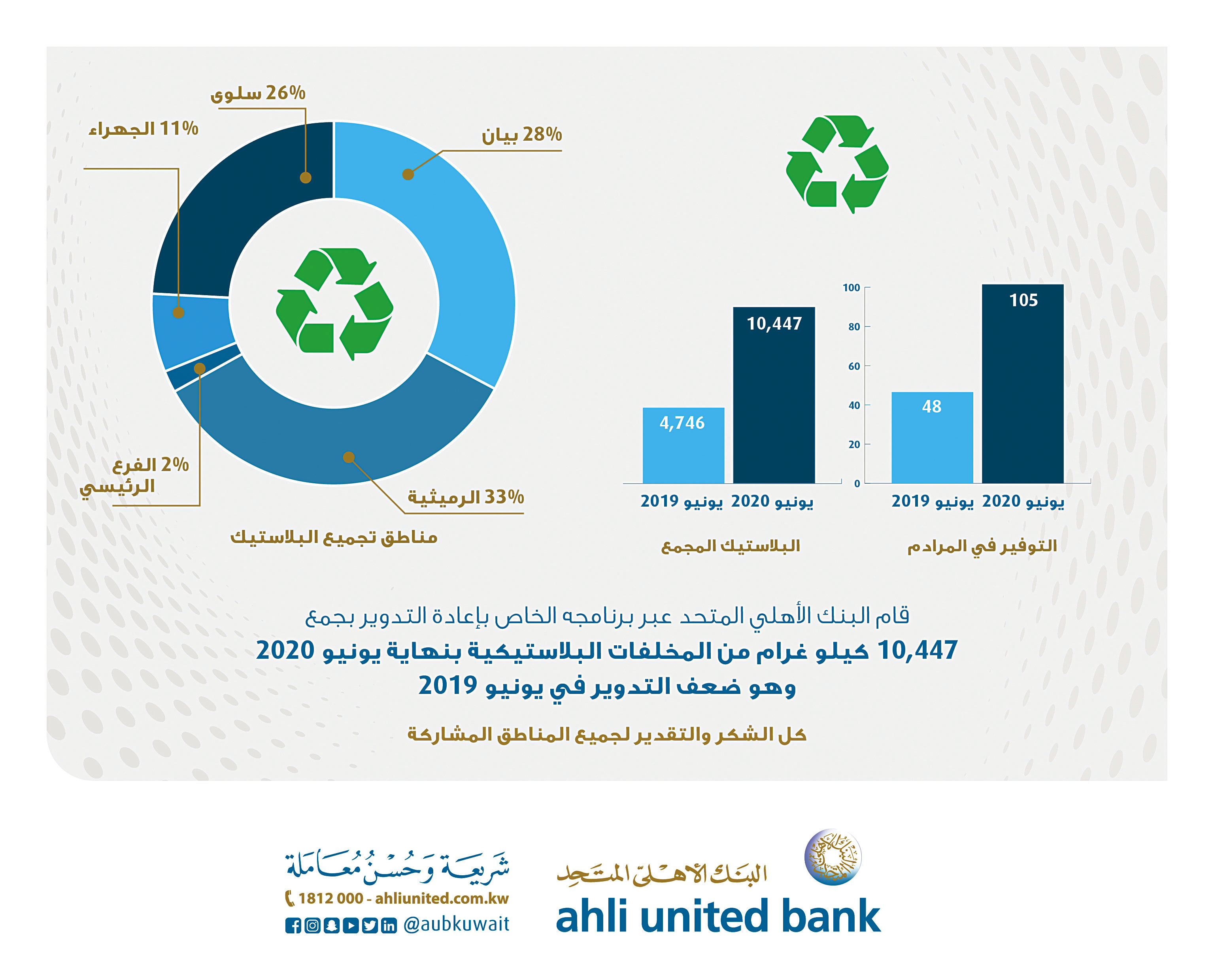 في إطار جهوده المجتمعية، التي تضع الاهتمام بالبيئة ودعمها على قائمة أولوياته، واصل البنك الأهلي المتحد نجاح برنامجه الخاص بإعادة التدوير بالشراكة مع مصنع أمنية لإعادة تدوير البلاستيك، واستطاع تجميع أكثر من 104 آلاف كيلوغرام من النفايات البلاستيكية خلال النصف الأول من العام الحالي، وهو ما يقارب ضعف الكمية التي تم تجميعها خلال نفس الفترة من العام الماضي.وقام البنك من خلال تلك المبادرة بوضع صناديق في مقره الرئيسي وجميع الأفرع، مع إقامة نقاط تجميع في عدد من مناطق الكويت، مثل سلوى والرميثية وبيان والجهراء واليرموك، وتم وضع حاويات التجميع الرئيسية بالقرب من أفرع البنك لزيادة تواجد نقاط التجميع وخدمة سكان هذه المناطق.وخلال النصف الأول من عام 2020، أثمر نجاح هذه المبادرة عن توفير مساحة 104 أمتار مكعبة من المرادم، وفضلا عن الانعكاس الإيجابي لتقليل كمية النفايات التي تشكل تهديدا للبيئة، تساهم هذه المبادرة من البنك الأهلي المتحد في تعزيز ثقافة إعادة التدوير التي أصبحت جزءا من تطور المجتمعات ومصدرا للدخل الاقتصادي.