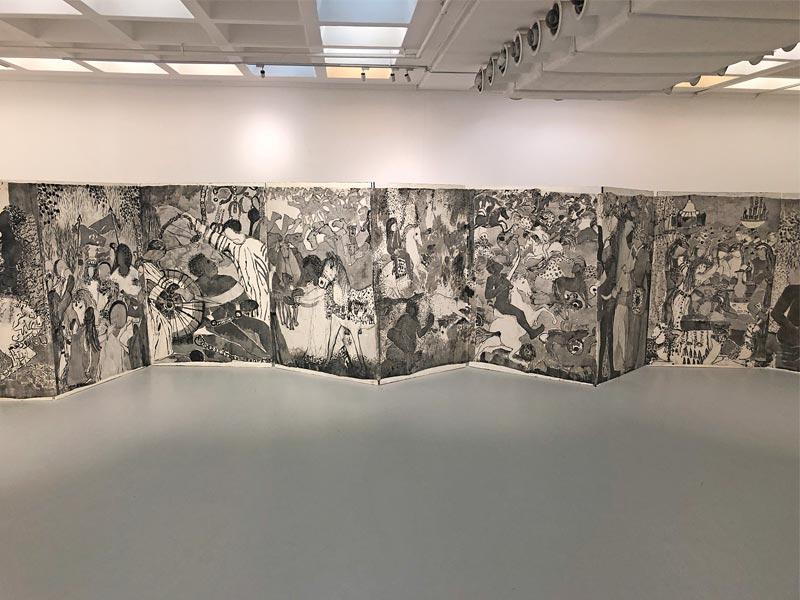 وأعطت نموذجا لجدارية بعنوان "تحية إلى عنترة"، رسمتها الفنانة اللبنانية فاطمة الحاج، وبطل العمل الفارس عنترة بن شداد، صاحب المعلقة المشهورة التي ألهمت الفنانة فاطمة الولوج إلى عالم هذا الشاعر الفارس، بمعرض عنونته "كُرّ وأنت حر"، وهي المفردة التي قالها له والده بعد الاعتراف به من قبل والده، "كُر وأنت حر". وأوضحت الشوا أن تجربة فاطمة الحاج تفتح حوارا عن معلقة من عيون الشعر العربي، لكن فاطمة الحاج قررت أن تعتمد خيارات مغايرة بأسلوبها، ورؤيتها الفنية الخاصة، فالفنانة جردت عنترها من كل العتاد واللباس، وحتى من الشاربين كدلالة على البطولة والفحولة والرجولة، فأبصرته إنسانا بفطرته الأولى التي ورثها من أبيه آدم في جنته.وتساءلت الشوا: "ماذا عن الألوان؟" لتقول: اكتفت فاطمة الحاج بتدرجات الأبيض والأسود وغابت الألوان، وكأنها أحالت اللونين إلى استخدام الضوء والظل في تلوين اللوحة، وأضحى اللون تعبيرا عن حالتي النور والعتمة، عتمة الاستعباد والظلم والتميز العنصري على أساس اللون، في مقابل النور في نهاية الجدارية، هي رحلة من الظلام إلى النور، وكأنها كما يقول د. سليمان العسكري: "تعلن رفضها المطلق للتفرقة، والعنصرية، والاستعلائية"، وتقول فاطمة عن عنترة إنه صورة مضيئة من تاريخنا العربي. حارب العنصرية التي ما زالت اليوم تشكل عبئا بشريا، وتزداد وتيرتها مع صعود حركات التطرف في العالم أجمع، حيث عادت الكراهية والعنصرية، والتصنيفات، بتبريرات لا تمت إلى القاسم المشترك الإنساني بصلة.وأضافت أن التمعن بهذه الجدارية قد يشجع الجيل الجديد على قراءة مجددة لشعر عنترة، أو التعامل معه بمنظور جديد، مشيرة إلى حاجتنا إلى تجديد العلاقة مع الشعر العربي القديم، وأن الفنون أنجح الطرق لفتح قنوات جديدة للتعامل مع هذا الإرث، وهذا ينقلنا إلى علاقة بين نص أدبي عربي، وفنان عربي آخر من الموروث القديم، وهو كتاب المقامات لماتبه أبو محمد الحريري، الذي عاش في القرن 12 ميلاديا، مشيرة إلى أن كتاب المقامات كان "Best seller" في عصره، حيث ظهر فن كتابة المقامات كما يقول د. ثروت عكاشة في كتابة "موسوعة التصوير الإسلامي"، لأن المقامة في اللغة هي المجلس، يقوم به الأديب محدثا الجمع، المنصت إليه.فصيح القول