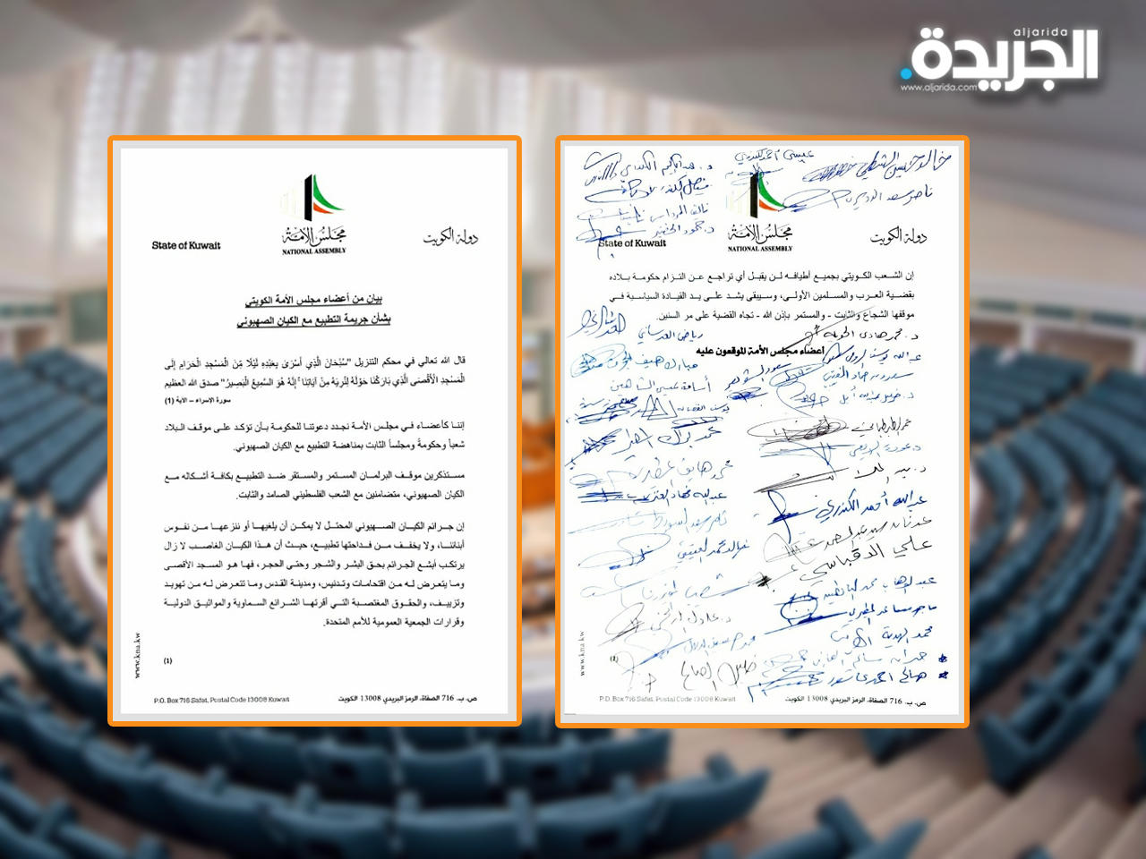 أصدر 38 نائبا في مجلس الأمة بياناً بشأن جريمة التطبيع مع الكيان الصهيوني، داعين الحكومة للتأكيد على موقف البلاد من مناهضة التطبيع، والتضامن مع الشعب الفلسطيني الصامد.وجاء في نص البيان: "قال الله تعالى من محكم التنزيل (سبحان الذي أسرى بعبده ليلا من المسجد الحرام إلى المسجد الأقصى الذي باركنا حوله لنريه من آياتنا إنه هو السميع البصير). صدق الله العظيم" سورة الإسراء - الآية (1).إننا كاعضاء في مجلس الامة نجدد دعوتنا للحكومة بأن تؤكد على موقف البلاد شعبا وحكومة ومجلسا الثابت بمناهضة التطبيع مع الكيان الصهيوني، مستذكرين موقف البرلمان المستمر والمستقر ضد التطبيع بكافة اشكاله مع الكيان الصهيوني متضامنين مع الشعب الفلسطيني الصامد والثابت".