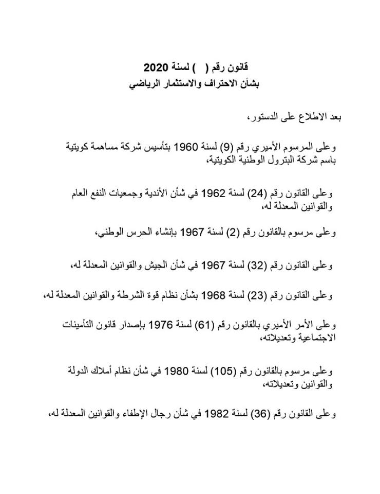 بات قانون الرياضة الجديد المدرج على جدول أعمال المجلس للتصويت قبل فض دور الانعقاد الحالي، في طريقه إلى النور، ليرسم حقبة جديدة للرياضة الكويتية، بعد أن أقرّت لجنة الشباب والرياضة البرلمانية اقتراحات الاحتراف والاستثمار الرياضي بعد إجراء التعديلات المتوافق عليها مع اللجنة الأولمبية الكويتية والاتحادات الرياضية وهيئتي الشباب والرياضة، على أن يتم صياغة التقرير، تمهيداً لإدراجه على جدول أعمال المجلس والتصويت عليه. وواكب قانون الاحتراف الجديد، الذي قدمه النائب أحمد الفضل، نظيره في الدول المتقدمة، وفق معايير الشفافية ومتطلبات الميثاق الدولي الأولمبي والقوانين المحلية، مما جعله مسار اهتمام للرياضيين، على أن يتم الأخذ في الاعتبار الملاحظات التي سيطرحها المهتمون بالشأن الرياضي لإجراء التعديلات النهائية قبل إقراره رسمياً. وحسب البنود التي احتواها قانون الرياضة الجديد، الذي يهدف إلى خلق بيئة رياضية جاذبة للمستثمرين، فإن من شأنه أن ينهي المفهوم الحالي الذي يعتمد على الدعم الحكومي، ليكون مفهوم الاحتراف والتنافس الذي يجلب الأموال للرياضيين والفرق هو الأساس، كذلك كان للألعاب الفردية نصيب من هذا الاهتمام. وفيما يلي نص القانون:بعد الاطلاع على الدستور، وعلى المرسوم الأمیري رقم (9) لسنة 1960 بتأسیس شركة مساهمة كویتیة باسم شركة البترول الوطنیة الكویتیة، وعلى القانون رقم (24) لسنة 1962 في شأن الأندیة وجمعیات النفع العام والقوانین المعدلة له، وعلى مرسوم بالقانون رقم (2) لسنة 1967 بإنشاء الحرس الوطني، وعلى القانون رقم (32) لسنة 1967 في شأن الجیش والقوانین المعدلة له، وعلى القانون رقم (23) لسنة 1968 بشأن نظام قوة الشرطة والقوانین المعدلة له، وعلى الأمر الأمیري بالقانون رقم (61) لسنة 1976 بإصدار قانون التأمینات الاجتماعیة وتعدیلاته، وعلى مرسوم بالقانون رقم (105) لسنة 1980 في شأن نظام أملاك الدولة والقوانین وتعديلاته، وعلى القانون رقم (36) لسنة 1982 في شأن رجال الإطفاء والقوانین المعدلة له، وعلى القانون رقم (19) لسنة 2000 في شأن دعم العمالة الوطنیة وتشجیعها للعمل في الجهات غیر الحكومیة والمعدل بالقانون رقم (32) لسنة 2003، وعلى القانون رقم (106) لسنة 2013 في شأن مكافحة غسل الأموال وتمویل الإرهاب والمعدل بالقانون رقم (24) لسنة 2016، وعلى القانون رقم (116) لسنة 2013 في شأن تشجیع الاستثمار المباشر في دولة الكویت، وعلى القانون رقم (116) لسنة 2014 بشأن الشراكة بین القطاعین العام والخاص، وعلى القانون رقم (97) لسنة 2015 في شأن إنشاء الهيئة العامة للریاضة، وعلى قانون الشركات الصادر بالقانون رقم (1) لسنة 2016 والقوانین المعدلة له، وعلى القانون رقم (33) لسنة 2016 بشأن بلدیة الكویت والمعدل بالقانون رقم (1) لسنة 2018، وعلى القانون رقم (87) لسنة 2017 في شأن الریاضة والمعدل بالقانون رقم (107) لسنة 2018،