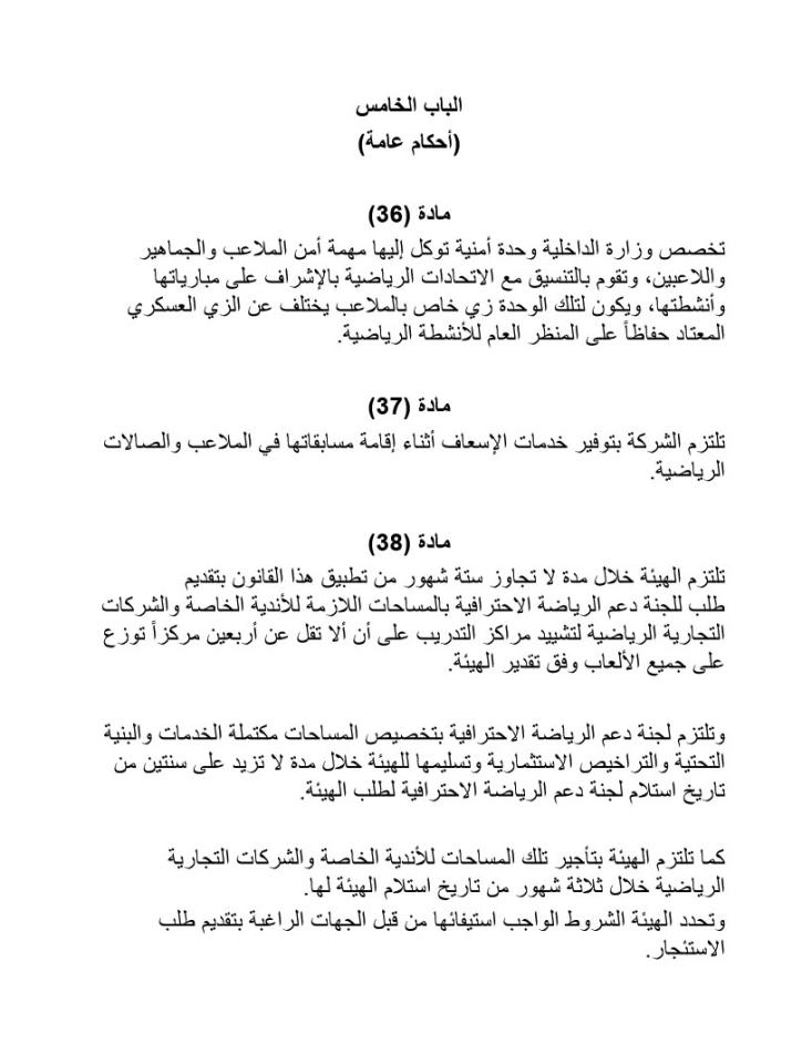 (أحكام عامة)مادة 36تخصص وزارة الداخلیة وحدة أمنیة توكل إلیها مهمة أمن الملاعب والجماهیر واللاعبین، وتقوم بالتنسیق مع الاتحادات الریاضیة بالإشراف على مباریاتها وأنشطتها، ویكون لتلك الوحدة زي خاص بالملاعب یختلف عن الزي العسكري المعتاد حفاظاً على المنظر العام للأنشطة الریاضیة.مادة 37تلتزم الشركة بتوفیر خدمات الإسعاف أثناء إقامة مسابقاتها في الملاعب والصالات الریاضیة.مادة 38تلتزم الهيئة خلال مدة لا تجاوز ستة شهور من تطبیق هذا القانون بتقدیم طلب للجنة دعم الریاضة الاحترافیة بالمساحات اللازمة للأندیة الخاصة والشركات التجاریة الریاضیة لتشیید مراكز التدریب على ألا تقل عن أربعین مركزاً توزع على جمیع الألعاب وفق تقدیر الهيئة. وتلتزم لجنة دعم الریاضة الاحترافیة بتخصیص المساحات مكتملة الخدمات والبنیة التحتیة والتراخیص الاستثماریة وتسلیمها للهیئة خلال مدة لا تزید على سنتین من تاریخ استلام لجنة دعم الریاضة الاحترافیة لطلب الهيئة. كما تلتزم الهيئة بتأجیر تلك المساحات للأندیة الخاصة والشركات التجاریة الریاضیة خلال ثلاثة شهور من تاریخ استلام الهيئة لها. وتحدد الهيئة الشروط الواجب استیفاؤها من قبل الجهات الراغبة بتقدیم طلب الاستئجار.مادة 41 یلغى كل حكم یتعارض مع أحكام هذا القانون.مادة 42یصدر الوزیر المختص القرارات اللازمة لتنفیذ أحكام هذا القانون خلال ثلاثة شهور من تاریخ نشره في الجریدة الرسمیة، وتسري اللوائح والقرارات المعمول بها فیما لا یتعارض مع أحكامه. مادة 43على رئیس مجلس الوزراء والوزراء – كل فیما یخصه –تنفیذ هذا القانون.