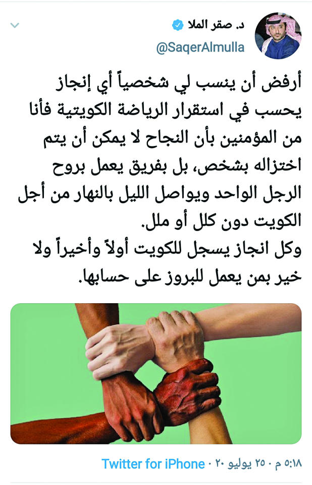 ويضع الملا، الحاصل على الماجستير والدكتوراه في علم دراسة الحركة الرياضية من الولايات المتحدة، نصب عينيه تطوير الرياضة بشكل أكاديمي وعلمي مدروس، وفقا لخطط محددة وبعيداً عن التخبطات... وفيما يلي التفاصيل: