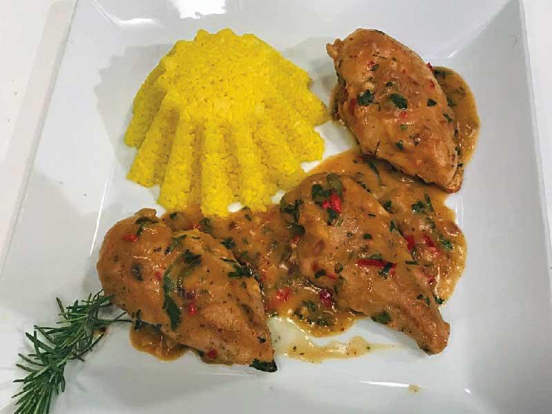 في مقلاة على النار نضع الزبدة، ثم صدور الدجاج ونشوحها مع التقليب على الوجهين حتى تكتسب اللون الأحمر، ثم ننشلها في صحن ونتركها جانباً، وفي المقلاة نفسها نضع البصل والفلفل الألوان والفلفل الحار والملح ونقوم بتشويحهم ثم نضع المرق ونضيف صدور الدجاج التي تم تحميرها من قبل ونتركها لمدة 10 دقائق على نار هادئة، وفي كوب نضع النشا ونقلب جيداً ثم نضيفه إلى الدجاج مع كوب لبن جوز الهند، وأخيراً تُزين برشة الكسبرة الخضراء، ويقدم الطبق ساخناً مع الأرز. رول الدجاج بحشو السبانخ