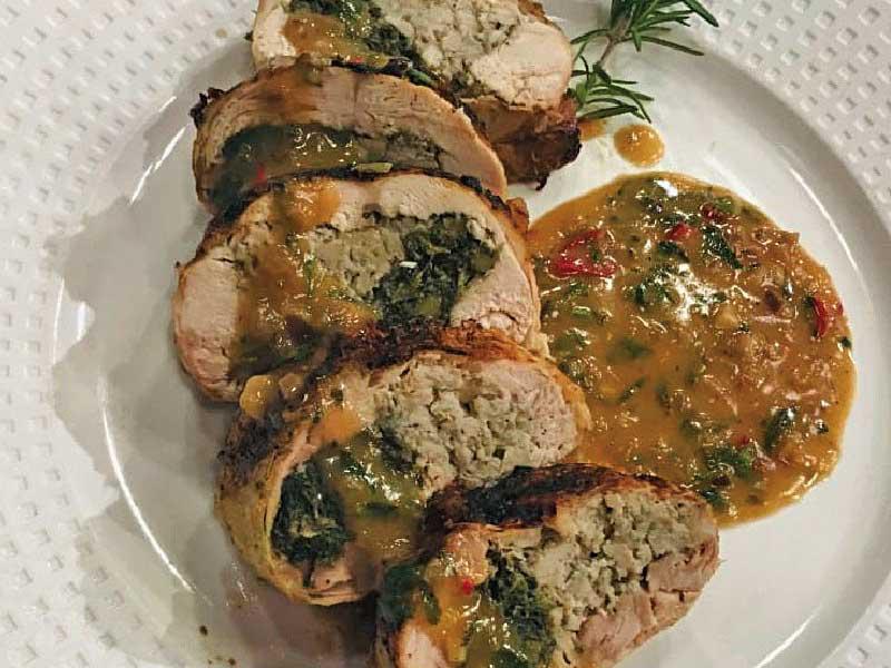 نغسل الدجاجة المخلية جيداً ونتبلها بالملح والفلفل، ثم نجهز الحشوة في مقلاة على نار هادئة حيث نضع الزبدة ثم الثوم المفروم ثم السبانخ والفلفل الألوان ونقوم بالتقليب لدقيقتين ونرفعها عن النار ونتركها حتى تبرد، ثم نضيف الجبنة الموتزاريلا، وبعد تمام التبريد للحشوة نفرد الدجاجة ونتبلها بالملح والفلفل الأسود، ثم نضع الحشوة على طرفي الدجاجة من كل اتجاه ونقوم بلفها عن طريق غلق كل الحشوة من الأطراف إلى المنتصف، ونغلقها جيداً بالخيط المخصص للطعام وندهن وجهها بالزبدة ونضعها في صينية وندخلها الفرن في الرف الأوسط على درجة حرارة 180 مدة ساعة حتى تنضج ثم نخرجها ونتركها حتى تبرد تماماً قبل التقطيع. سلطة كابريزي الإيطالية