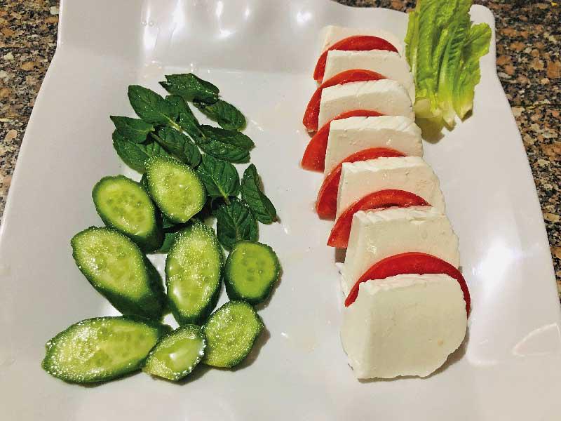 جبنة قليلة الملحشرائح طماطمشرائح خيارورق ريحان طازجالطريقة: