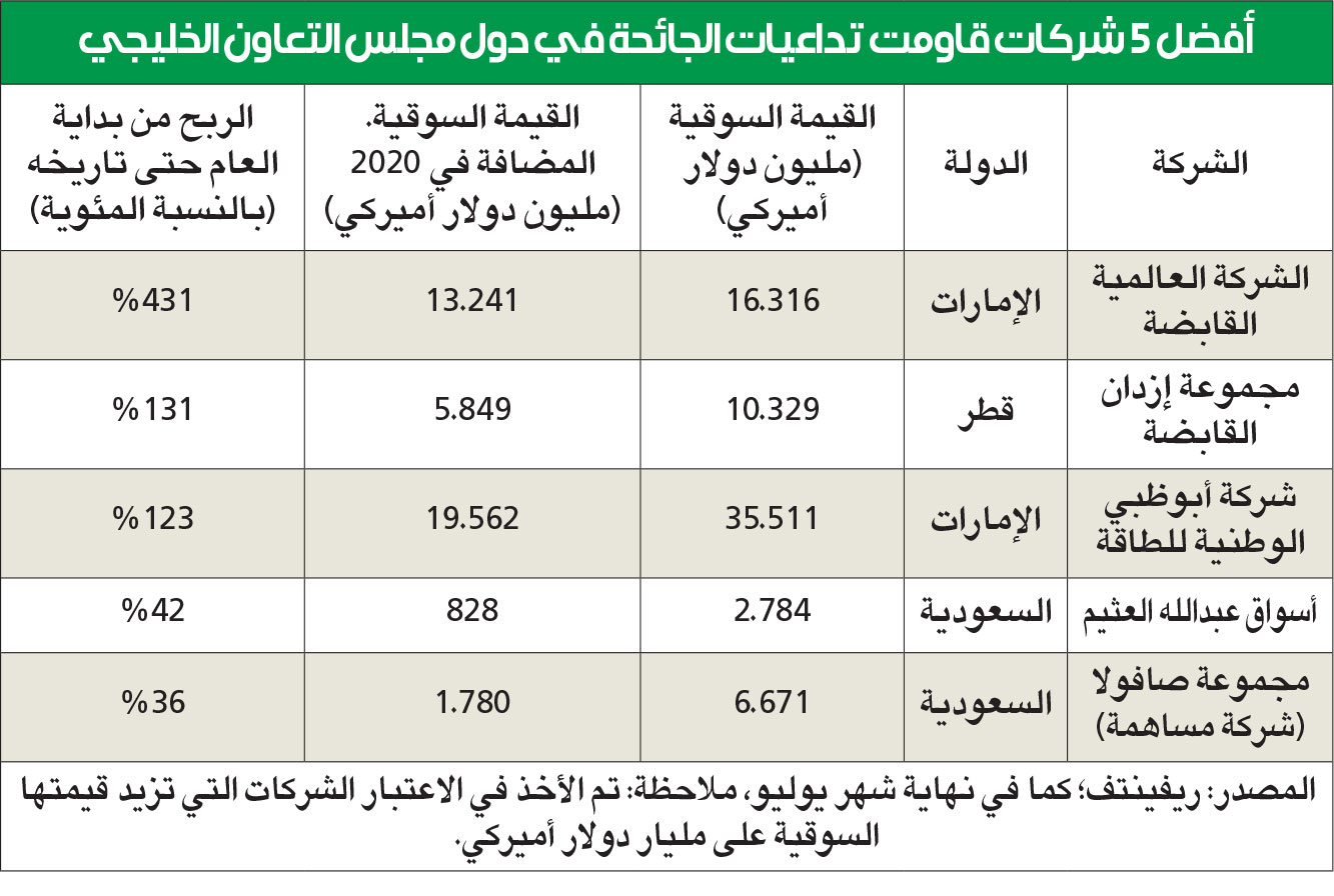 قال المركز المالي الكويتي «المركز» في تقريره الصادر أخيراً بعنوان «الأسهم الخليجية المقاومة لتداعيات الجائحة»، إن 2020 كان عاماً صعباً على أداء أسواق الأسهم والشركات الخليجية، إذ تسبب تفشي فيروس كورونا بمعاناة بالغة للمستثمرين وسط تدهور أداء الأسواق على مستوى العالم. ووفق التقرير، لم يطرأ أي اختلاف على أداء الأسواق الخليجية، إذ سجل المؤشر القياسي (مؤشر ستاندرد آند بورز المُركّب لدول مجلس التعاون الخليجي) خسارة بواقع 15 في المئة لهذا العام حتى نهاية يوليو. وفي حين ينتظر المستثمرون تقرير الأرباح لاستيعاب الصورة الكاملة لتداعيات الجائحة المترتبة على الأعمال، تولى «المركز» تحليل أداء الأسهم للفصل بين الشركات الرابحة والخاسرة في الأسواق الخليجية.
