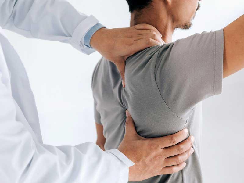 قف باستقامة مقابل جدار. مدّد ذراعك اليمنى، تزامناً مع فتح مرفقك، وضع يدك على الجدار، بمستوى كتفك. حرّك أصابعك ببطء نحو الأعلى واتجه نحو الجدار فيما تعلو أصابعك المتحركة. توقف حين تشعر بتشنج بسيط في كتفك. حافظ على هذه الوضعية بين 10 و30 ثانية. ثم حرك أصابعك ببطء نحو الخلف وعُدْ إلى وضعية البداية. كرر التمرين ثلاث أو أربع مرات، مع تشغيل الذراعين تباعاً.قف مقابل باب أو جدار. مدّد ذراعك اليمنى وضعها على طرف إطار الباب، تحت مستوى الكتف بقليل، ووجّه كفّك إلى الأمام والمس الباب. خفّض كتفيك وأرجعهما إلى الوراء. ثم حرك جسمك ببطء نحو اليسار، بعيداً عن إطار الباب، إلى أن تشعر بتمطط صدرك وكتفك. حافظ على هذه الوضعية بين 10 و30 ثانية، ثم عد إلى وضعية البداية. كرر التمرين ثلاث أو أربع مرات، ثم شغّل الجهة الثانية.قف وافتح قدميك بِعَرض وركَيك. ضع يدك اليسرى على كتفك الأيمن، وأمسك مرفقك الأيسر بيدك اليمنى. حرك كتفيك بشكل دائري نحو الأسفل والخلف، تزامناً مع سحب مرفقك الأيسر بهدوء نحو صدرك. حافظ على هذه الوضعية بين 10 و30 ثانية، ثم عد إلى وضعية البداية. كرر التمرين ثلاث أو أربع مرات، ثم شغّل الجهة الثانية.حركة تدوير الكتف