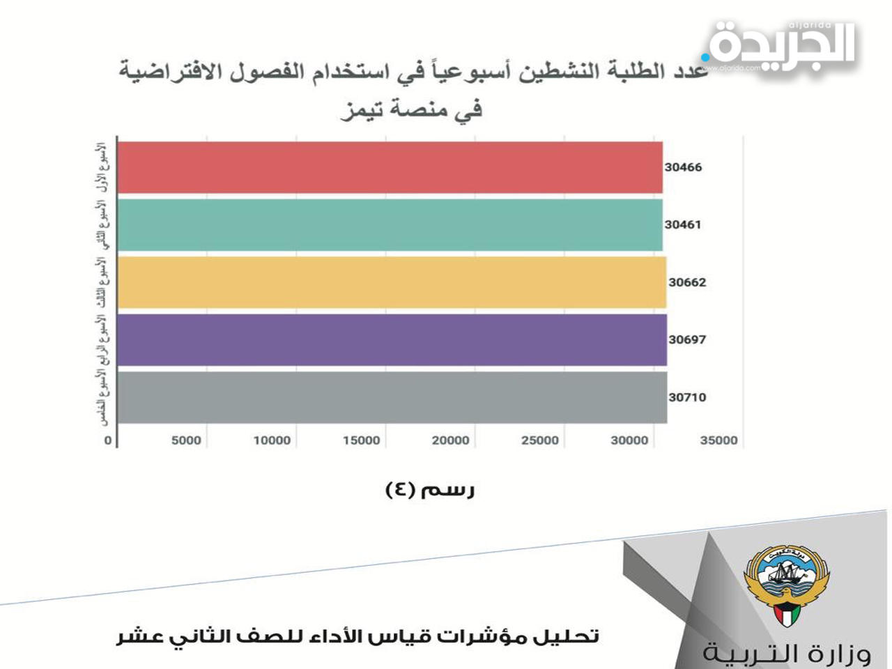 وبينت أن المتوسط الأسبوعي لعدد لطلبة النشطين في استخدام الفصول الافتراضية في منصة تيمز بلغ 30,599 طالب وطالبة، منوهة إلى أنه يعكس مدى التزام الطلبة بحضور الفصول الافتراضية خلال فترة الدراسة بشكل ثابت وهذه مؤشرات تدل على تجاوب الطلبة مع الفصول الافتراضية وتُظهر تفاعلاً متزامناً جيداً بين المعلم والمتعلم في منصة تيمز.