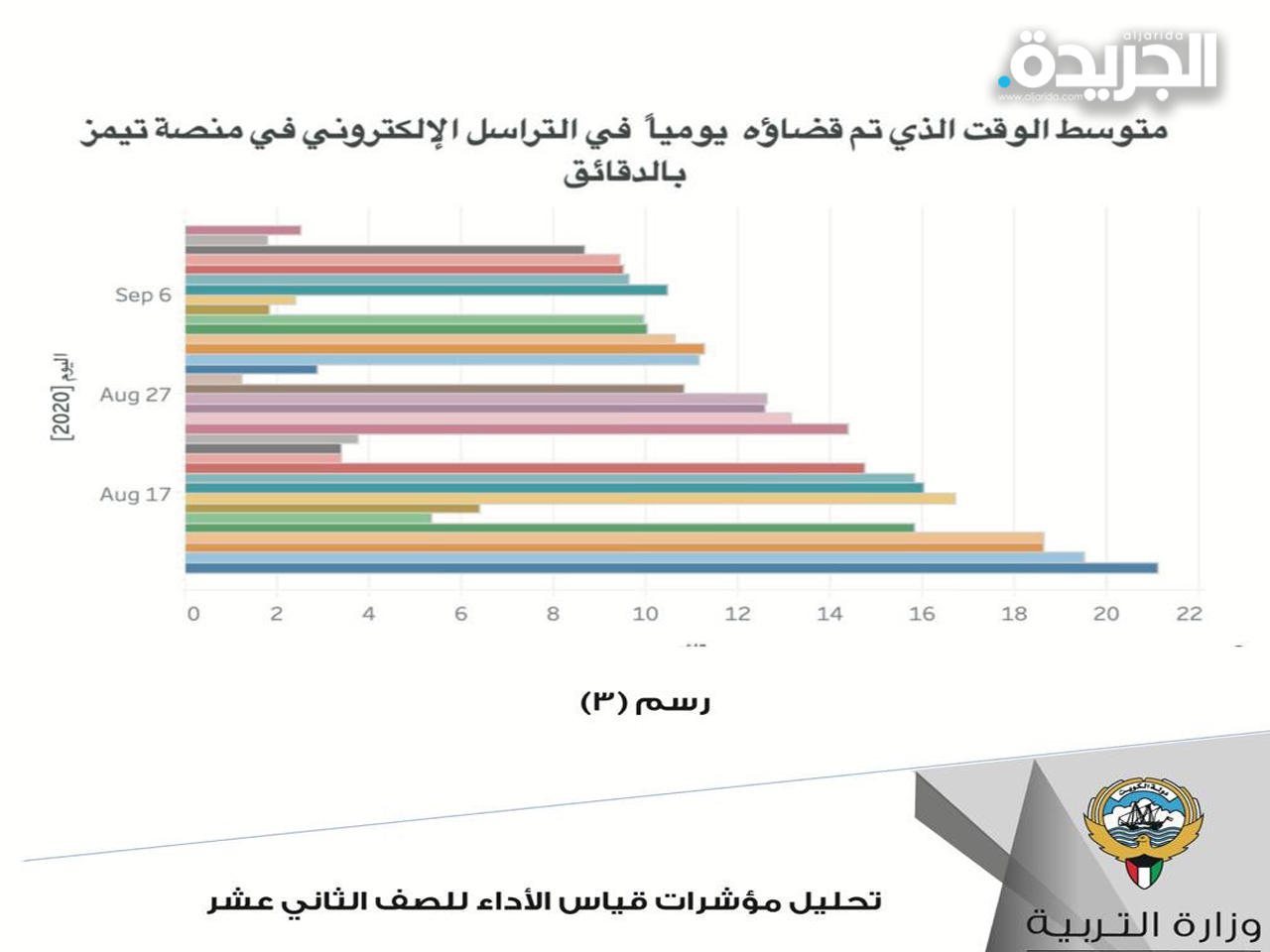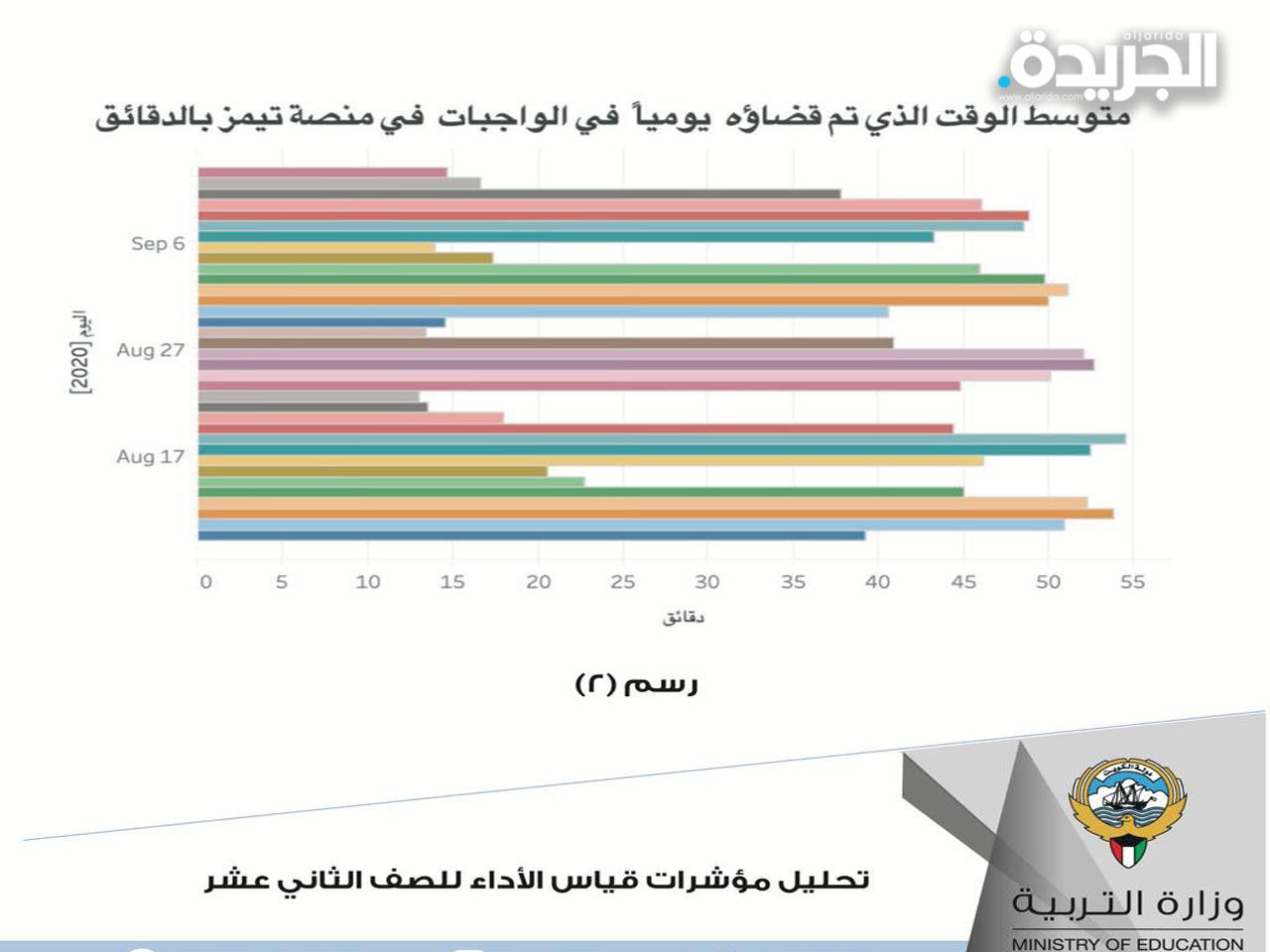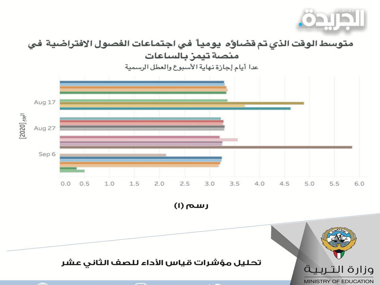 أكدت وزارة التربية أن التزام الطلبة في اجتماعات الفصول الافتراضية في منصة تيمز خلال فترة استكمال الفصل الدراسي الثاني من العام 2020/2019 كان في حدود الـ 3.4 ساعة يومياً، موضحة أن هذا المتوسط يدل على تفاعل متزامن جيد بين المعلم والمتعلم وهو أيضاً متوسط متوافق مع الفترة المخصصة للفصول الافتراضية يومياً.وأضافت «التربية» في دراسة تحليلية تضمنت رسوم بيانية ونتائج تحليلة لمؤشرات قياس الأداء لتطبيق التعليم عن بعد للصف الثاني عشر، أن الطالب كان يقضي حوالي 38.6 دقيقة كمتوسط لحل واجباته، لافتة إلى أنه متوسط يدل على تفاعل غير متزامن جيد للطلبة مع مصادر التعلم وأنشطة الفصل التعليمية.