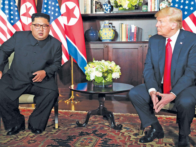 لقاء الرئيس الأميركي دونالد ترامب والزعيم الكوري الشمالي كيم جونغ أون في اجتماعهما الأول في سنغافورة