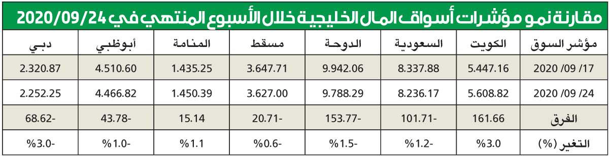 طغى اللون الأحمر على محصلة مؤشرات الأسواق المالية الأسبوعية بدول مجلس التعاون الخليجي خلال تعاملات أسبوعها الرابع لشهر سبتمبر، حيث تراجعت 5 مؤشرات بنسب كبيرة في معظمها، وسجل مؤشرا بورصتي الكويت والبحرين نموا معاكسا بنسب استثنائية للأول بلغت 3 في المئة لمؤشر السوق العام، ونسبة 1.1 في المئة لمؤشر سوق البحرين المالي، في حين جاءت أكبر الخسائر من نصيب مؤشر سوق دبي المالي بنسبة 3 في المئة، تلاه مؤشر سوق قطر بنسبة 1.5 في المئة، وخسر مؤشر السوق السعودي بعد 8 أسابيع من النمو المتتالي نسبة 1.2 في المئة، في حين فقد مؤشر أبوظبي نسبة 1 في المئة، وكان مؤشر سوق مسقط الأقل خسارة بنسبة 0.6 في المئة.
