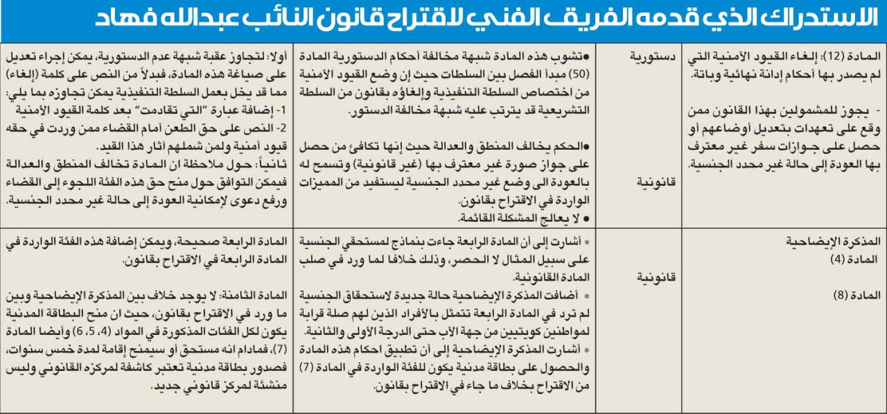 من جانبه، استغرب النائب عبدالله فهاد رفض اللجنة التشريعية الاقتراح الذي قدّمه مع مجموعة من النواب بشأن "البدون"، بحجة عدم دستوريته، مشيرا الى أنه قدّم تعديلات، إلا أن اللجنة لم تأخذ بها. وقال فهاد، في تصريح له: "حضرت اجتماعين للتشريعية لمناقشة قانون النواب بشأن البدون، وقدمت استدراكات قانونية على التعليقات الفنية، لكن اللجنة لم تراع تلك التعديلات ورفضت القانون بحجة عدم الدستورية في سعي حثيث لتمرير قانون "غير توافقي" تطفو منه رائحة الفوقية والعنصرية ومحاولة بائسة على حساب جراحات البدون وآلامهم".وأضاف أن "أيادي عبثية تحاول تكريس واقع أثبت فشله، وعلى المخلصين من رجالات الدولة وقوى المجتمع الحيّة وضع حد لاستنزاف موارد الدولة المهدرة من أجيال البدون، وعلى جمعية المحامين الدفاع عن مشروعها والوقوف خلفه ومتابعته، فتبديد الأمل وإشاعة اليأس يتزامنان مع الخراب والبؤس". وعرض فهاد ردّ الفريق الفني لاقتراح القانون الذي قدّمه مع النواب، إذ جاء فيه: استدراك على مذكرة بالرأي القانوني عن الاقتراح بقانون في شأن معالجة غير محددي الجنسية داخل الكويت المقدّم من النواب عبدالله فهاد، ونايف المرداس، وعدنان عبدالصمد، وخالد العتيبي، وشعيب المويزري، المحال بصفة الاستعجال. وتضمن الاستدراك أنه بناء على إحالة رئيس مجلس الأمة الاقتراح بقانون المشار إليه إلى لجنة الشؤون التشريعية والقانونية بتاريخ 24/8/2020، لدراسته وتقديم تقرير بشأنه إلى المجلس، وعلى ضوء المذكرة المرفوعة من المكتب الفني للجنة بتاريخ 26/8/2020 والملاحظات الواردة من طرفه، حرصنا نيابة عن مقدمي الاقتراح على شرح وإيضاح بعض ما التبس من صياغات أو مفردات، راجين أن تجد طريقها إلى المراجعة والتوافق، فقد کنا ولا زلنا نأمل أن يكون عنوان التلاقي بين اقتراحات القوانين المطروحة.وأوضح الاستدراك على الرأي القانوني أن "مجمل الملاحظات الواردة على الاقتراح بقانون قابلة للمناقشة والمراجعة، وقد حرصنا على إيضاح أغلب الملاحظات وتسديدها بالتأصيل والاستدلال والمناقشة، أملا في الوصول إلى توافقات يمكن البناء عليها للمضيّ في مسار الاقتراح بقانون وتحقيق أثر ملموس يترقّبه الكثيرون، وقد أجملنا تعقيبنا في قائمة الاستدراك على مضمون الملاحظة، وهي نتاج لمشاركة عدد من الباحثين والخبراء المختصين نأمل أن تجد لديكم الاهتمام والعناية التي تأملها".