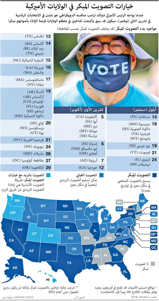 في غضون ذلك، أشار استطلاع رويترز - أيبسوس إلى تقلص الفارق بين ترامب وبايدن في 6 ولايات متأرجحة هي فلوريدا ونورث كارولينا وأريزونا وبنسلفانيا وويسكانسن وميشيغان.وأرجعت صحيفة وواشنطن بوست تصاعد حظوظ المرشح الجمهوري في هذه الولايات إلى مؤشرات التعافي الاقتصادي وخلق الوظائف الأخيرة.وبحسب استطلاع أجرته قناة "إيه بي سي"، فإن عائلات العسكريين منقسمة بشأن التصويت في الانتخابات الرئاسية المقبلة، مبينة أن ترامب وبايدن حصلا بالتساوي على تأييد نسبة 49 بالمئة من أصواتهم.وفي وقت سابق، أثار ترامب موجة غضب، بعدما أشار إلى إنه قد لا يقبل بنتائج انتخابات 3 نوفمبر إذا تعرّض للهزيمة. وأدى موقفه إلى مقارنات بدكتاتوريين لا يخضعون للقانون، كرئيسي بيلاروس وكوريا الشمالية، وأثار مخاوف من أنه قد يقوّض النظام الديمقراطي الأميركي من خلال تمسكه بالسلطة.وأعدّ ترامب الذريعة في حال قرر الطعن على النتائج، إذ أصر في مناسبات مختلفة على أن الديمقراطيين سيستولون على عشرات الملايين من بطاقات الاقتراع المرسلة بالبريد لتزوير نتائج التصويت.
