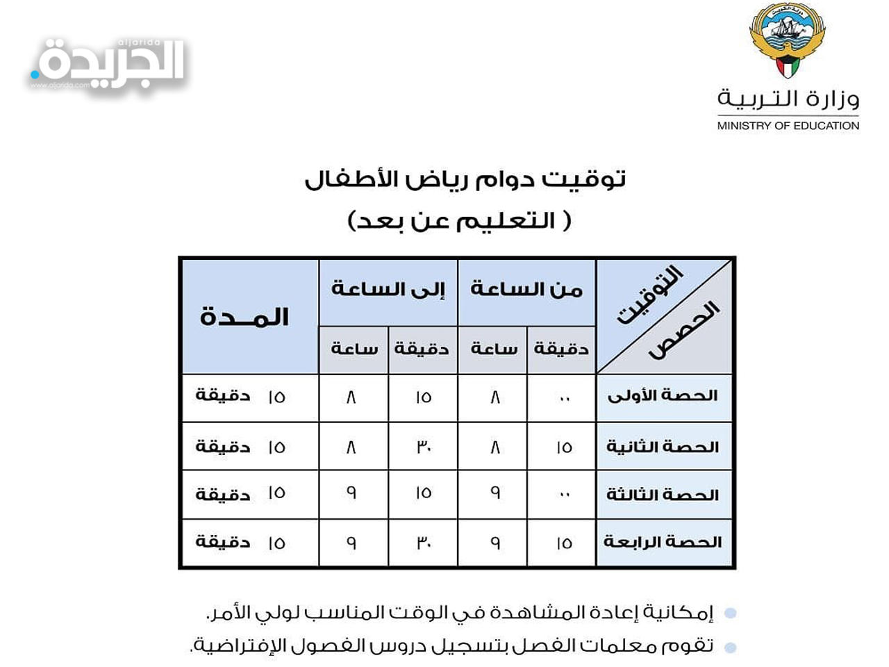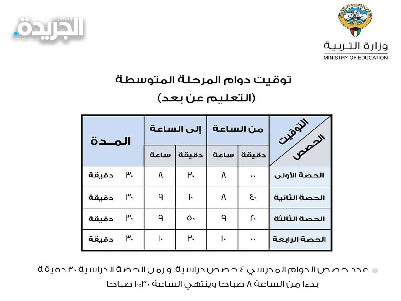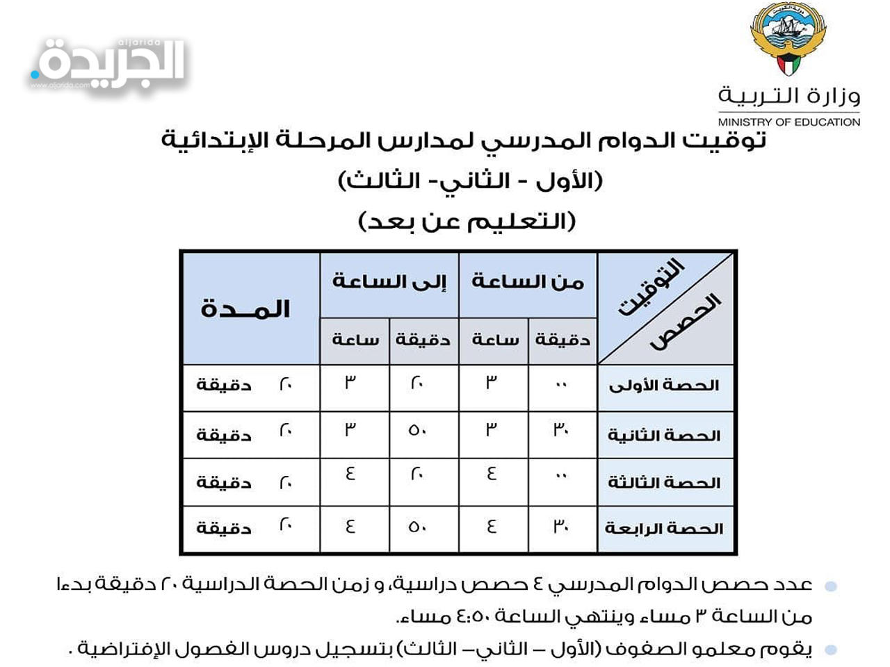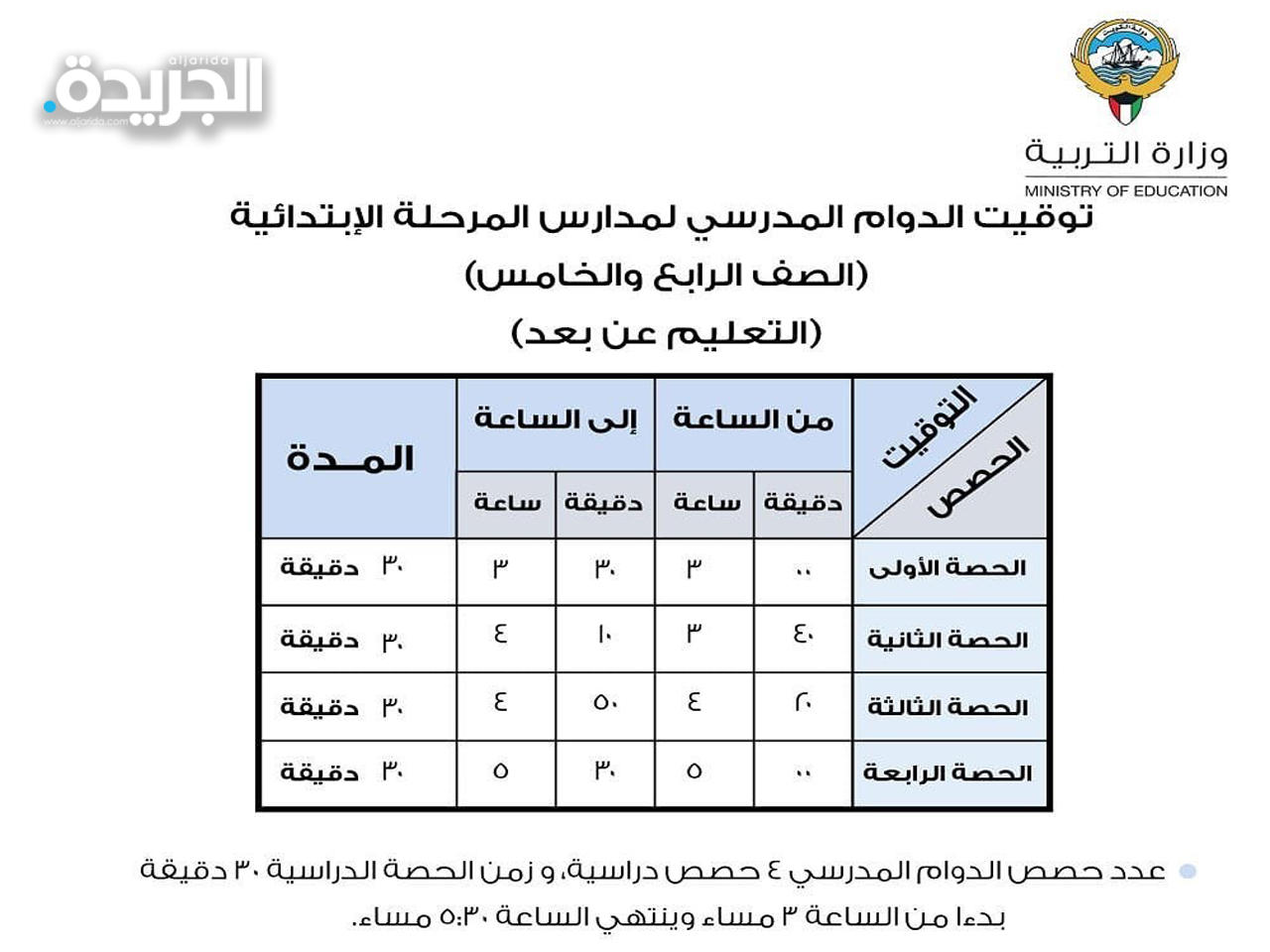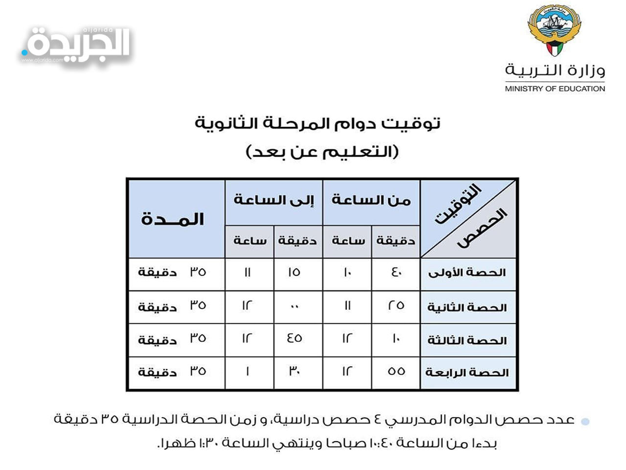 1- رياض الأطفال من الساعة 8 صباحاً وحتى الساعة 12 ظهراً.2- المرحلة الابتدائية من الساعة 8 صباحاً وحتى الساعة 1 ظهراً، على أن تقوم إدارة كل مدرسة بتقسيم العمل بين العاملين ليشمل الفترة المسائية من الساعة 2.45 ظهراً وحتى الساعة 5.45 مساء.3- المرحلة المتوسطة من الساعة 8 صباحاً وحتى الساعة 1 ظهراً. 4- المرحلة الثانوية من الساعة 9 صباحاً وحتى الساعة 2 ظهراً.كما حددت وزارة التربية توقيت الدوام المدرسي للطلبة عبر التعليم عن بعد ليكون كالتالي:1- عدد حصص الدوام المدرسي للمرحلة الابتدائية بالصفوف (الأول - الثاني - الثالث) 4 حصص دراسية تسجل، وتبدأ من الساعة 3 مساء حتى الساعة 4.50 مساء، وزمن كل حصة 20 دقيقة.2- عدد حصص الدوام المدرسي للمرحلة الابتدائية بالصفين (الرابع – الخامس) 4 حصص دراسية تبدأ الساعة 3 مساء وحتى الساعة 5.30 مساء، وزمن كل حصة 30 دقيقة.3- عدد حصص الدوام المدرسي للمرحلة المتوسطة 4 حصص دراسية تبدأ من الساعة 8 صباحاً وتنتهي الساعة 10.30 صباحاً، وزمن الحصة الواحدة 30 دقيقة.4- عدد حصص الدوام المدرسي للمرحلة الثانوية 4 حصص دراسية تبدأ من الساعة 10.40 صباحاً وتنتهي الساعة 1.30 ظهراً، وزمن الحصة الواحدة 35 دقيقة