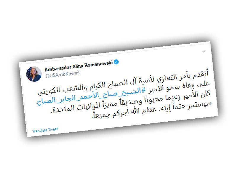 تقدمت السفارة الأميركية لدى الكويت بأحر التعازي إلى أسرة آل الصباح، وإلى الكويت حكومة وشعباً، بوفاة سمو الأمير المغفور له الشيخ صباح الأحمد.وجاء في تغريدة للسفارة عبر "تويتر": نشارككم الحزن، ولا ننسى الإنجازات الاستثنائية لسمو الأمير الراحل، الذي كرس حياته للسلام والاستقرار الإقليمي.ومن جهتها، تقدمت سفيرة الولايات المتحدة لدى البلاد ألينا رومانوسكي بأحر التعازي لأسرة آل الصباح والشعب الكويتي بوفاة سمو الأمير.وقالت رومانوسكي، عبر تغريدة لها على "تويتر"، إن الأمير كان زعيماً محبوباً وصديقاً مميزاً للولايات المتحدة، وسيستمر إرثه حتماً، وعظم الله أجركم جميعاً.