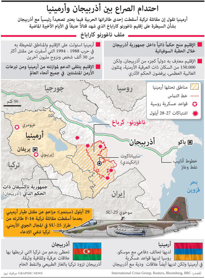 يتخوف المراقبون من ان النزاع بين ارمينيا واذربيجان يتجه نحو مواجهة طويلة الامد بعد أن رسمت باكو مدعومة من انقرة سقفاً عالياً باستعادة السيطرة على اقليم ناغورني قره باغ. وقد يكون التحذير الروسي والفرنسي لأنقرة من صب الزيت على النار مؤشراً واضحاً الى ان هذا النزاع القديم الجديد اصبح ساحة للصراعات الدولية والإقليمية من ليبيا الى المتوسط وصولا الى جنوب القوقاز.