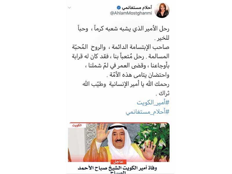 مواقف وطنيةوقال الشاعر الفلسطيني مريد البرغوثي، على حسابه في موقع تويتر: "أمير الكويت مات متمسكا بمواقفه الوطنية ومؤيدا للحق الفلسطيني. تعازيّ للأصدقاء في الكويت ولشعبها الكريم". من جانبه، ذكر د. جمال المجايدة: "إنا لله وإنا إليه راجعون، قد أصابني من الحزن ما أصابكم فلا تيأسوا والله يسمع دعاءكم"، بعد عمر حافل بالعطاء والإنجازات في خدمة شعبه وأمته العربية والإسلامية.كما نعى الاعلامي سالم مريشيد الأمير الراحل وقدم تعازيه للشعب الكويتي على صفحته بموقع التواصل الاجتماعي، وكتب: "نتقدّم بأحر التعازي بوفاة الشيخ صباح الأحمد رحمه الله.. إنا لله وإنا إليه راجعون".أما الكاتبة الروائية السعودية جوهرة بنت محمد الصالح فكتبت كلمة مؤثرة عبرت عن حزن عميق، خصوصاً أنها فقدت والدها فجاءت تعزيتها حزينة: "يا رب تكون نفس الشيخ صباح الأحمد بالسماء آمين.. يا رب فلتسترح نفس عبدك الشيخ صباح الأحمد وأعطه الراحة الأبدية.. آمين».وأضافت جوهرة: "أتقدم بالعزاء للعائلة الكريمة والشعب الكويتي الشقيق، إنا لله وإنا إليه راجعون".وقدم الشاعر اليمني محمد عبدالله المسمري، قصيدة رثاء للراحل ممتدحاً ثبات سموه على الحق ومساندته وحدة الصف العربي، مشيراً إلى أياديه الخيرة ووقوفه مع الفقراء والمعوزين.بدوره، نعى الفنان التشكيلي حلمي التوني، أمير دولة الكويت الراحل الشيخ صباح الأحمد. ونشر التوني عبر صفحته بـ"فيسبوك" تدوينة جاء فيها: "رحيل أمير الكويت، كل الحكام العرب لهم ما لهم وعليهم ما عليهم، عدا (حكيم العرب)، الشيخ صباح الأحمد، له فقط ولا عليه".من جانبها، قررت وزارة الثقافة في مصر تعليق جميع الأنشطة والفعاليات لمدة ثلاثة أيام حتى الأول من أكتوبر، تنفيذاً لقرار إعلان الحداد العام لرحيل الشيخ صباح الأحمد أمير الكويت.
