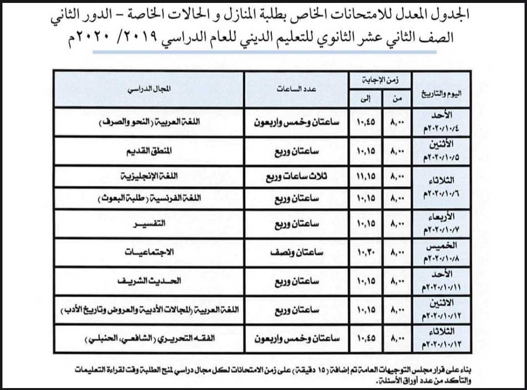 أصدرت وزارة التربية الجداول المعدلة لاختبارات طلبة المنازل والحالات الخاصة والدور الثاني والتي تم تأجيلها نظراً لحالة الحداد على وفاة الأمير الراحل الشيخ صباح الأحمد، طيب الله ثراه.