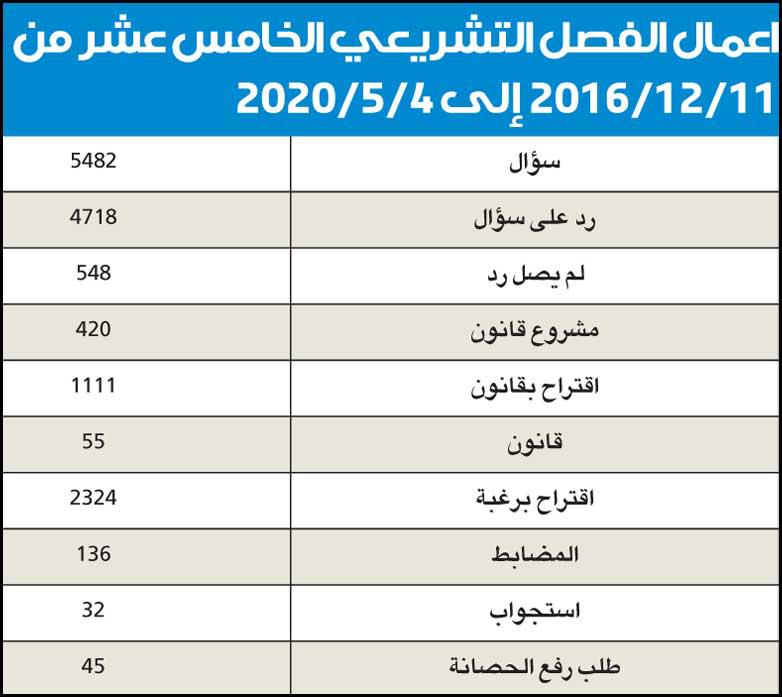 في حين حدد مجلس الامة غدا الخميس موعد فض دور الانعقاد الرابع من الفصل التشريعي الخامس عشر، شهدت إحصائية الأعمال البرلمانية تزايدا في استخدام الأدوات الرقابية من النواب من جانب وإقرار القوانين من جانب آخر.وأظهرت الاحصائية التي اعدتها الأمانة العامة لمجلس الأمة وحصلت "الجريدة" على نسخة منها عن اعمال المجلس من اسئلة برلمانية ومشاريع قوانين حكومية واقتراحات بقوانين نيابية واقتراحات برغبة تزايدا في نشاط وأعمال المجلس مع اقتراب انهاء دور الانعقاد الرابع. وقدم خلال الفترة من 11 ديسمبر 2016 حتى 4 الجاري 5482 سؤالا برلمانيا، أجاب الوزراء عن 4718 سؤالا، بينما لم يجيبوا عن 548.