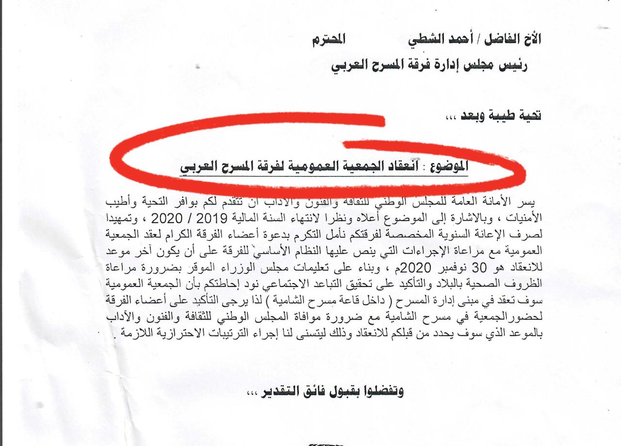 وخاطب المجلس المسارح الأهلية في كتاب وصل لـ"الجريدة" نسخة منه جاء فيه: نظرا لانتهاء السنة المالية 2019-2020، وتمهيدا لصرف الإعانة السنوية المخصصة لفرقتكم نأمل التكرم بدعوة أعضاء الفرقة لعقد الجمعية العمومية مع مراعاة الإجراءات التي ينص عليها النظام الأساسي للفرقة، على أن يكون آخر موعد للانعقاد 30 نوفمبر 2020، وبناء على تعليمات مجلس الوزراء بضرورة مراعاة الظروف الصحية بالبلاد، والتأكيد على تحقيق التباعد الاجتماعي، نود إحاطتكم بأن الجمعية العمومية ستعقد في مبنى إدارة المسرح داخل قاعة مسرح الشامية، لذا يرجى التأكيد على أعضاء الفرقة لحضور الجمعية في مسرح الشامية، مع ضرورة موافاة المجلس بالموعد الذي سيحدد من قبلكم للانعقاد، ليتسنى لنا إجراء الترتيبات الاحترازية اللازمة.وانتهى كتاب المجلس الموقع من الدكتور عيسى الأنصاري، الأمين العام المساعد لقطاع الثقافة والفنون. الجدير بالذكر، أن الجمعيات العمومية كانت تعقد قبل جائحة كورونا في مقرات المسارح، لمناقشة التقريرين المالي والإداري، وجاء مسرح الشامية ليكون حلا بديلا لعقد جميع الجمعيات العمومية للمسارح الأهلية فيه، لضمان الاشتراطات الصحية تحت إشراف لجان المجلس الوطني.ظروف استثنائية