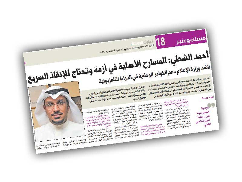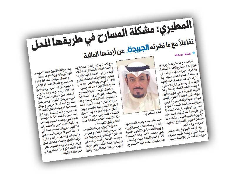 وتأتي هذه الخطوة استجابة وتفاعلاً مع ما نشرته «الجريدة» 16 سبتمبر في حوارها مع المخرج أحمد الشطي رئيس مجلس إدارة فرقة المسرح العربي، والذي أكد خلاله رداً على سؤال «الجريدة»، أن المسارح الأهلية تعيش أزمة مالية كبيرة وميزانياتها تقترب من حافة الصفر، مناشداً وزير الإعلام محمد الجبري، والأمين العام للمجلس كامل العبدالجليل، سرعة التدخل لإنقاذ هذه الفرق العريقة.... وإلى التفاصيل: