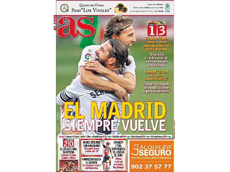 انهالت الصحف الإسبانية بعبارات المديح لفريق ريال مدريد بقيادة المدرب زيدان بعد الفوز بالكلاسيكو أمس الأول، في وقت حاولت بعض الصحف إلقاء اللوم على القرارات التحكيمية وتقنية «الفار».