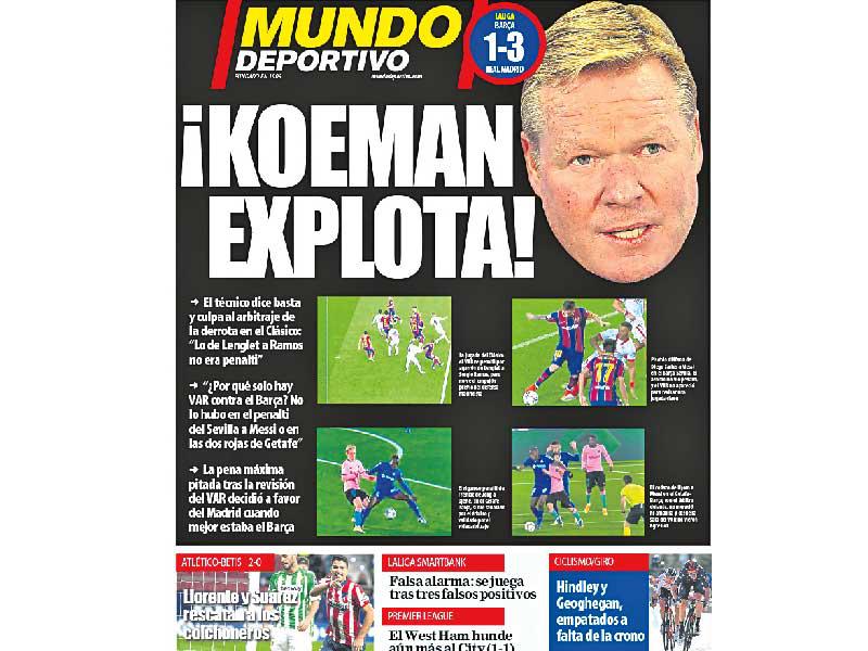 على الجانب الآخر، ألقت الصحف الكتالونية باللوم على الفار حتى أن صحيفة "سبورت" استخدمت اللعب بالألفاظ، ووصفت نتيجة الكلاسيكو بأنها "سطو كلاسيكي".ولم تتردد الصحيفة في وضع حكم اللقاء، خوان مارتينيز مونويرا، على صفحتها الرئيسية والإشارة إلى أنه "منح الفوز للريال في الكلاسيكو بالإشارة إلى غطس لراموس في منطقة الجزاء".واعتبرت "سبورت" أن ركلة الجزاء هذه، التي جاء منها الهدف الثاني (ق 62) بتوقيع راموس، "كسرت مباراة كانت السيطرة فيها للبرشا الذي كان قد عادل النتيجة بواسطة أنسو (فاتي) بعد الهدف الأول من (فيدي) فالفيردي".من جانبها، سلّطت "موندو ديبورتيفو" الضوء على غضب المدرب الهولندي، مشيرة على صدر صفحتها الرئيسية إلى أن "كومان ينفجر". وأضافت أن "المدير الفني يقول كفى ويلوم التحكيم على الهزيمة في الكلاسيكو: ما فعله لونجليه لراموس لا يستدعي ركلة جزاء".واعتبرت الصحيفة أن "ركلة الجزاء احتسبت للريال عقب اللجوء للفار في الوقت الذي كان فيه البرشا في أفضل حالاته".وبهذا الانتصار يتصدر الريال الليغا بعدما حصد النقطة الـ13، بينما تجمد رصيد برشلونة عند سبع نقاط من خمس مباريات محتلا المرتبة الـ 12.