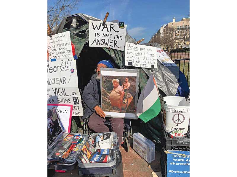 أمام البيت الأبيض، وعلى بعد عشرات الأمتار، يجلس المشرد فيليبوس ميلاكو في خيمته الصغيرة، وهو يضع لافتات تحمل رسوما تعبيرية مسيئة للرئيس الأميركي ترامب وضد سياساته، ما إن تقترب منه حتى تجده يكيل أبشع الألفاظ ضد الرئيس، ويصر على ألا تمنحه دولارا واحدا دون أن تشتري منه أي منشور ضد ترامب.