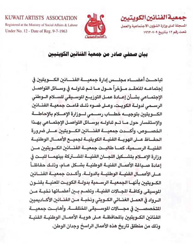 تفاعل مجلس إدارة جمعية الفنانين الكويتيين مع فكرة إعادة عمل التوزيع الموسيقي للسلام الوطني لدولة الكويت، التي انتشرت على وسائل التواصل الاجتماعي خلال الساعات الأخيرة، وقد أصدر المجلس بيانا بهذا الخصوص ورد لـ "الجريدة" نسخة منه وهذا ما جاء فيه:تباحث أعضاء مجلس إدارة جمعية الفنانين الكويتيين، في اجتماعه المنعقد أخيرا، حول ما تم تداوله في وسائل التواصل الاجتماعي بشأن إعادة عمل التوزيع الموسيقي للسلام الوطني الرسمي لدولة الكويت، وعلى ضوء ذلك قامت الجمعية بتوجيه خطاب رسمي لوزارة الإعلام بالإحاطة والاستفسار حول ما تم تداوله بوسائل التواصل بهذا الخصوص. وأكدت الجمعية ضرورة الحفاظ على الهوية الفنية الكويتية لجميع الأعمال الوطنية الفنية الرسمية، كما طالبت وزارة الإعلام بتشكيل اللجان الفنية المشتركة بينهما لبتّ إعادة صياغة الأعمال الفنية الوطنية بشكل عام، وذلك حفاظا على الأعمال الفنية الوطنية بالدولة".