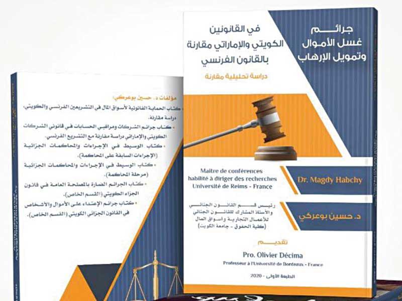 اصدر د. حسين بوعركي رئيس قسم القانون الجزائي والأعمال التجارية وأســــواق المال، ود. مجدي حبشي استاذ القانون في جامعة ونس الفرنسية كتاباً بعنوان «جرائم غسل الأموال وتمويل الإرهاب» وفق القانونين الكويتي والاماراتي مقارنة بالقانون الفرنسي، ويتضمن الكتاب أحكام القانون رقم 106/2013 بشأن غسل الأموال وتمويل الارهاب واتجاهات القضاء وأحكام قانون غسل الأموال الاماراتي ومقارنة بالتشريع الفرنسي.