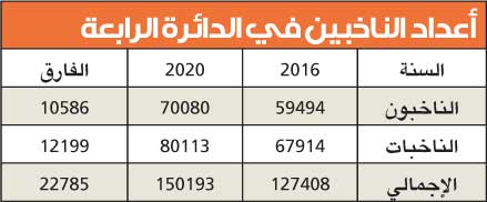 ومن المفارقات التي تظهرها سجلات الدائرة، أنه رغم غياب العنصر النسائي عن الترشح منذ 7 سنوات، فإنها تعتبر الدائرة الوحيدة التي سجلت نسبة زيادة من بين الدوائر الانتخابية في قيود النسائية الجديدة، وإن كان بفارق ضئيل وبنسبة 0.05 في المئة، لكنها السمة الوحيد التي تحققت فيها من بقية الدوائر، لتشكل بذلك زيادة الناخبات عن الناخبين نسبة 53.5 في المئة من إجمالي القيود الجديدة المسجلة ما بين 2016 و2020.وفي الوقت ذاته، تعتبر "الرابعة" من أعلى الدوائر التي تشهد أعلى معدل في سباق الترشح لعضوية مجلس الأمة 2020 من نوابها الحاليين في "مجلس 2016"، إذ يخوضها 9 نواب من أصل 10، باستثناء النائب سعود الشويعر الذي أعلن عدم ترشحه.وفي قراءة القاعدة الانتخابية للدائرة، تظهر بيانات ناخبيها زيادة في عدد القيود الانتخابية بنسبة 15 في المئة، إذ كان إجمالي القيود في انتخابات 2016 يبلغ 127408، في حين يبلغ إجمالي القيود في سجلات الانتخابات الحالية 150193، بمقدار زيادة تبلغ 22785 ناخباً وناخبة على مدى 4 سنوات.وبالمقارنة بين قيود انتخابات 2016 و2020 تظهر سجلات الدائرة أن أعداد الناخبين كانت 59494 عام 2016، وارتفعت في سجلات 2020 إلى 70080، بزيادة تبلغ 10586 ناخباً، وبنسبة 15.1 في المئة، في حين بلغت أعداد الناخبات 67914، عام 2016، وفي سجلات الانتخابات الحالية 80113، بزيادة 12199 ناخبة، وبنسبة نحو 15.2 في المئة.زيادة الناخبات