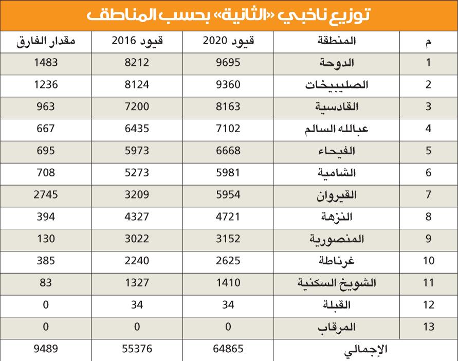 وتظهر السجلات أن زيادات ناخبي الدائرة شملت أغلب مناطقها، في حين لم تشهد أي منها انخفاضا في سجلات ناخبيها، في حين ظلت منطقة المرقاب دون تسجيل أي قيد انتخابي.وفي تفصيل المناطق، تحتل منطقة الدوحة المرتبة الأولى بتسجيلها 9695، وتشكل نسبة 15 في المئة من إجمالي الناخبين، وتأتي منطقة الصليبخات في المرتبة الثانية بتسجيلها 9360 ناخبا، وتشكل نسبة 14.4 في المئة، في حين تقع منطقة القادسية في المرتبة الثالثة بتسجيلها 8163 ناخبا، بنسبة 12.5 في المئة، وتحتل منطقة عبدالله السالم المرتبة الرابعة بتسجيلها 7102، بنسبة 11 في المئة، وتأتي منطقة الفيحاء بالمرتبة الخامسة، بتسجيلها 6668 قيدا انتخابيا، وتشكل نسبة 10 في المئة.القيروان... أعلى زيادة
