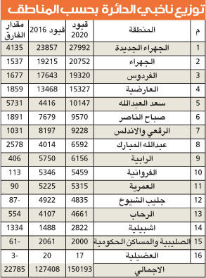 كما أظهرت المقارنة بين سجلات الناخبين بين عامي 2016 و2020، تقدم منطقة سعد العبدالله 6 مراكز على قائمة أكثر المناطق تكوينا لناخبي الدائرة، فبعد ان كانت في المرتبة 11 في سجلات 2016، احتلت اليوم المرتبة الخامسة، كما تقدمت عبدالله المبارك 5 مراكز في ذات القائمة، فبعد ان كانت تحتل المرتبة 13 في سجلات 2016، احتلت اليوم المرتبة الثامنة.أما من ناحية أكثر المناطق تسجيلا لعدد الناخبين على التوالي، فأتت في المرتبة الأولى سعد العبدالله بـ5731 قيدا، تلتها الجهراء الجديدة بتسجيل 4135 قيدا، ثم عبدالله المبارك بـ2578، بعدها صباح الناصر بـ1891، ثم في المرتبة الخامسة العارضية بـ1859 قيداً.وبالمقارنة بين سجلات 2020 و2016، من ناحية أكثر المناطق التي شهدت انخفاضاً في أعداد ناخبيها، تأتي جليب الشيوخ أولى، إذ سجلت انخفاض 87 قيداً عما كان مسجلاً في 2016، تليها منطقة الصليبية والمساكن الحكومية بانخفاض 61 ناخباً عما كان مسجلاً في 2016، وتأتي منطقة العضيلية في المرتبة الثالثة بانخفاضها 3 ناخبين عن 2016.أما المناطق التي شهدت أقل أعداد من الناخبين فجاءت على التوالي: العضيلية بـ17 قيداً، تليها الصليبية والمساكن الحكومية بـ2000 قيد، وإشبيلية بـ 2822، والرحاب بـ4661، وجليب الشيوخ بـ 4835 قيداً انتخابياً.