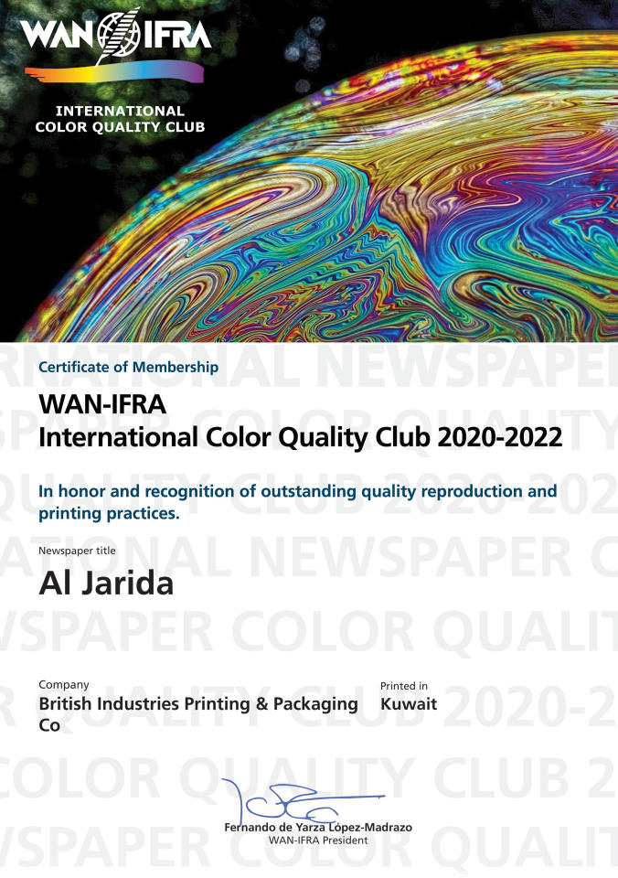 وتسلمت شركة "بي دبليو" البريطانية للطباعة، والتابعة لشركة الصناعات البريطانية إحدى شركات مجموعة تمدين، الجائزة عن مشاركتها في المسابقة بجريدة "الجريدة"، وهي مسابقة تقام كل عامين منذ عام 1994. ولقد تمكنت بمشاركتها الناجحة من استعراض مهاراتها، عبر مواكبة إنتاجها أعلى المعايير الدولية.وبذلك تكون شركة "بي دبليو" البريطانية قد حققت شرف العضوية في نادي الجودة الدولي لطباعة الصحف التابع لمنظمة "إيفرا" أربع دورات متتالية،2016-2014 INCQC و2018-2016 INCOC و2020-2018 INCQC و2022-2020INCQC إضافة إلى شهادة الآيزو لجودة طباعة الصحف 3-WAN - IFRA ISO12647، ومع هذه الشهادة أصبح لديها 6 نجوم للجودة، وأصبحت عضواً ذهبياً في نادي الخمس نجوم WAN IFRA Star Club، ولتنضم إلى مجموعة النخبة من مطابع الصحف في العالم.إن مسابقة نادي الجودة العالمي لطباعة الصحف هي مسابقة الجودة الوحيدة المتخصصة من نوعها في العالم في طباعة الصحف، والغرض منها تحسين نوعية الإنتاج والطباعة، فضلاً عن رفع سقف المنافسة، وذلك عبر تدريب وتحفيز الكوادر الفنية، حيث تحظى الصحف الفائزة بشرف العضوية الحصرية والاستثنائية لأعلى مراتب الجودة لمدة سنتين. والحصول على مثل هذا الاعتراف من قبل منظمة "إيفرا" العالمية، وتحقيق العضوية في نادي الجودة يأتيان تتويجاً للجهود المبذولة في التطوير والتحديث للحصول على أعلى مراتب الجودة التقنية والفنية، كما يعززان مكانة "الجريدة"، وشركة "بي دبليو" في تقديم مطبوعة ذات جودة عالمية ترضي رغبات القراء، وتلبي متطلبات المعلنين، بغية التأقلم مع اتجاهات السوق، وحاجات المستهلكين.