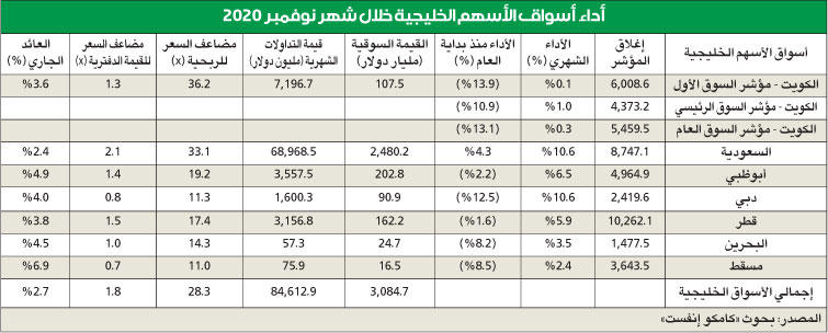 تحرك أداء مؤشر سوق أبوظبي بالاتساق مع الإشارات الإيجابية التي شهدتها دول مجلس التعاون بصفة عامة خلال شهر نوفمبر الماضي، وحقق مكاسب شهرية بنسبة 6.5 في المئة على أساس شهري. وأنهى المؤشر تداولات الشهر مغلقاً عند مستوى 4964.93 نقطة، وكان الأداء إيجابيا على صعيد كل القطاعات. كان سوق دبي المالي من أفضل الأسواق أداء على مستوى دول مجلس التعاون في نوفمبر الماضي إلى جانب السوق السعودية، إذ بلغت مكاسبه الشهرية 10.6 في المئة على أساس شهري. وأنهى المؤشر تداولات الشهر مغلقاً عند مستوى 2419.60 نقطة، وكان الأداء القطاعي إيجابيا بصفة عامة.قطر