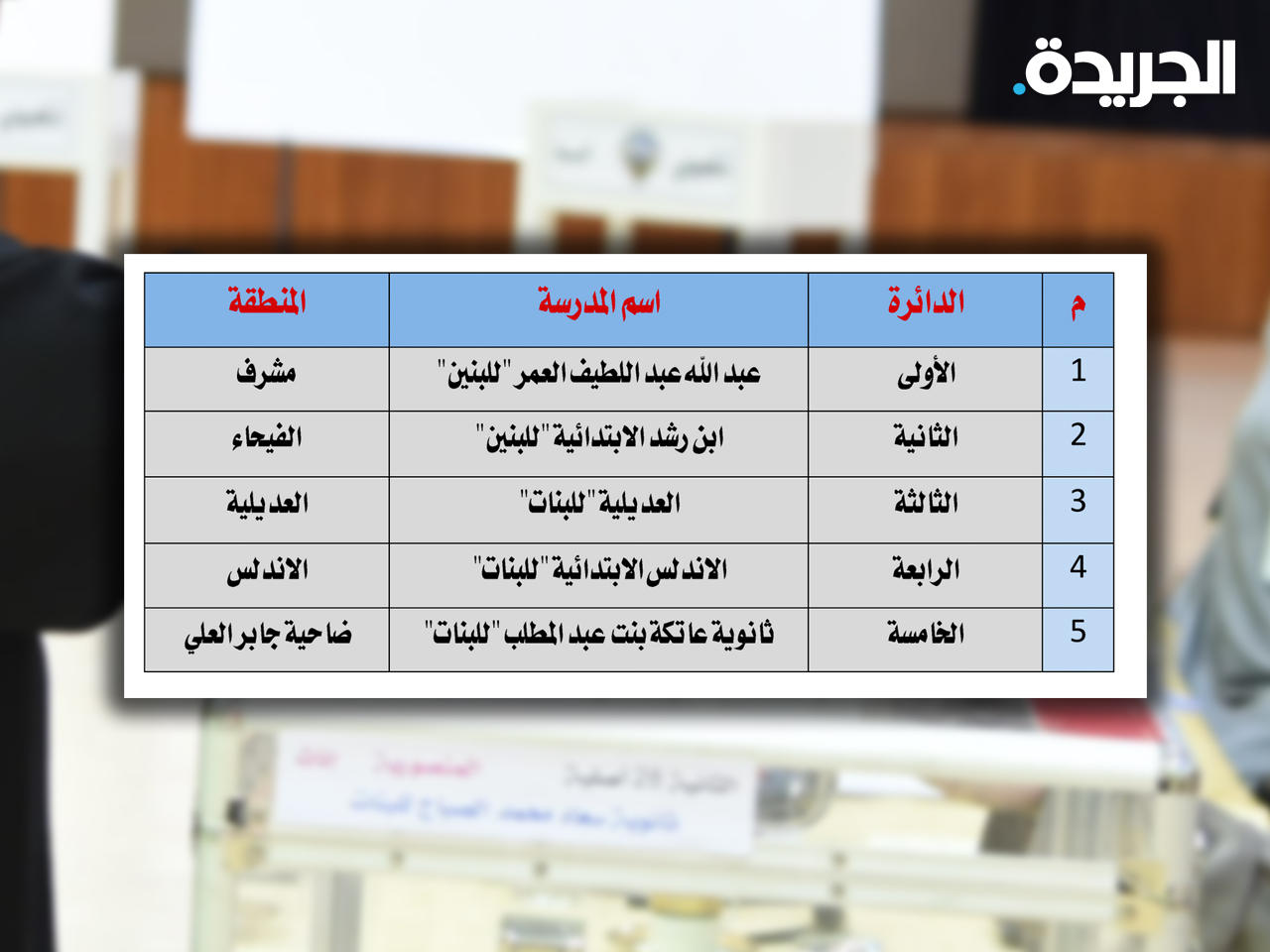 - الدائرة الثانية: مدرسة ابن رشد الابتدائية للبنين في منطقة الفيحاء.- الدائرة الثالثة: مدرسة العديلية للبنات في منطقة العديلية.- الدائرة الرابعة: مدرسة الأندلس الابتدائية للبنات في منطقة الأندلس.- الدائرة الخامسة: مدرسة ثانوية عاتكة بنت عبد المطلب للبنات في منطقة ضاحية جابر العلي.ويأتي ذلك ضمن حرص المؤسسة الأمنية والسلطات الصحية على صحة وسلامة المواطنين وتجنباً لانتشار الأمراض والأوبئة خلال العملية الانتخابية.