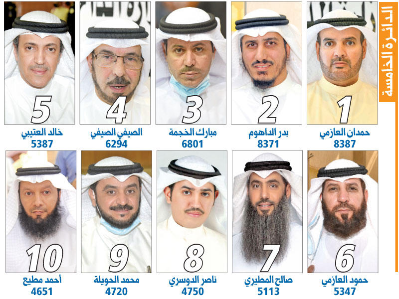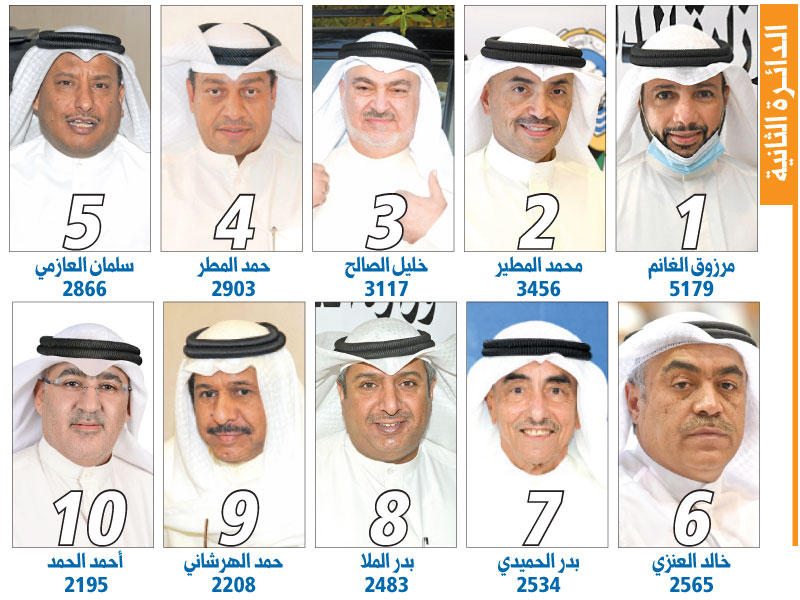 1- مرزوق الغانم - 5179 صوت2- محمد المطير - 3456 صوت3- خليل الصالح - 3117 صوت4- حمد المطر - 2903 صوت5- سلمان العازمي - 2866 صوت6- خالد العنزي - 2565 صوت7- بدر الحميدي - 2534 صوت8- بدر الملا - 2483 صوت9- حمد الهرشاني - 2208 صوت10- أحمد الحمد - 2195 صوت