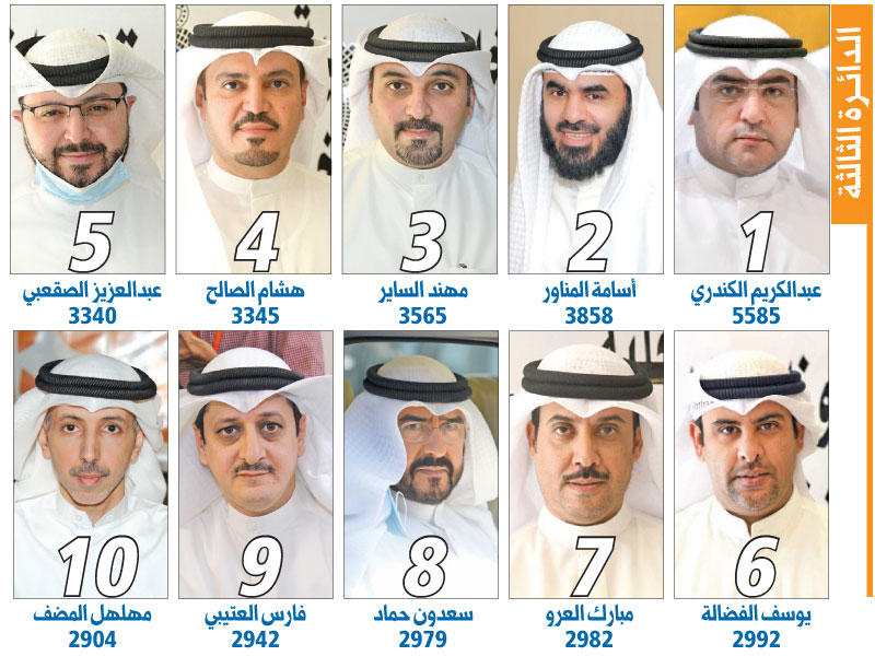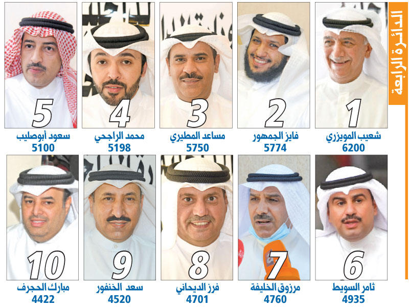 1- شعيب المويزري - 6200 صوت2- فايز الجمهور - 5774 صوت3- مساعد المطيري - 5750 صوت4- محمد الراجحي - 5198 صوت5- سعود أبوصليب - 5100 صوت6- ثامر السويط - 4935 صوت7- مرزوق الخليفة - 4760 صوت8- فرز الديحاني - 4701 صوت9- سعد الخنفور - 4520 صوت10- مبارك الحجرف - 4422 صوت