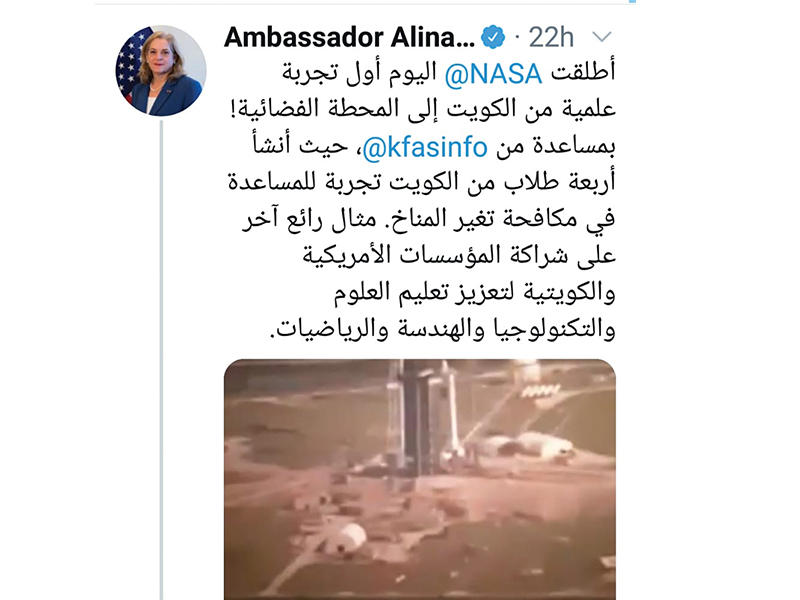 في إنجاز تاريخي جديد للكويت، أعلن المركز العلمي التابع لمؤسسة الكويت للتقدم العلمي نجاح إرسال أول تجربة علمية كويتية إلى محطة الفضاء الدولية، أمس الأول، بإطلاق صاروخ "فالكون- 9"، المصمم من شركة "سبيس أكس"، في مركز كيندي للفضاء في الولايات المتحدة، حاملاً معه تجربة صممها طلبة في الكويت لتسليمها إلى رواد الفضاء الموجودين على متن محطة الفضاء الدولية لتنفيذها في الفضاء نيابة عن الطلبة.وقالت المديرة العامة للمركز العلمي رنا النيباري، في كلمة بالمناسبة، إن التجربة تمثل حدثاً تاريخياً يعزز من مكانة الكويت ويضعها على خريطة الفضاء العالمية، معربة عن الفخر "بنجاح إطلاق أول تجربة علمية كويتية إلى الفضاء قام بها طلبتنا الذين أظهروا قدرتهم على النجاح والمثابرة، واستمروا بالعمل حتى خلال الظروف الصعبة هذا العام".