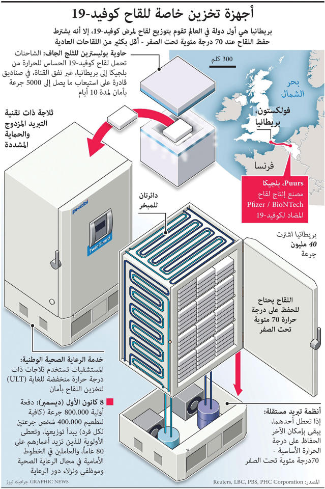 وتستعرض د. ميس عيسى، الاخصائية في علم الأوبئة في الجامعة الملكية البريطانية، مراحل نقل اللقاح التي وصفتها بالـ«معقدة»، مضيفة أن اللقاح يصل في صناديق وداخل كل صندوق، 5 علب، تحتوي كل علبة على 975 جرعة من اللقاح. وتضيف، أن هذه الصناديق خزنت في درجة حرارة 70 تحت الصفر، وبعد ذلك ينقل اللقاح في علب تحوي الثلج الجاف، وفي هذا الوعاء يبقى اللقاح لمدة 10 أيام من دون أن يتضرر، لكن هناك طرقاً معيّنة لفتح الصندوق لتفادي إتلاف اللقاح.بعد ذلك تترك الجرعة حتى تذوب وتتخلص من حالة التجمد، وحينها يمكن أن تبقى في البراد العادي في 4 درجات مئوية لمدة 5 أيام كحد أقصى.وكشفت عيسى، أن حجم كل جرعة هي 30 ميكروغراماً، وستكون المدة بين الجرعتين نحو 3 أسابيع، وقدمت توصيات خاصة للممرضات اللاتي سيقمن بعملية الحقن، للانتباه «لأن الحقن سيكون عضليا، وهذا يتطلب مهارات معينة».استنفار المستشفيات
