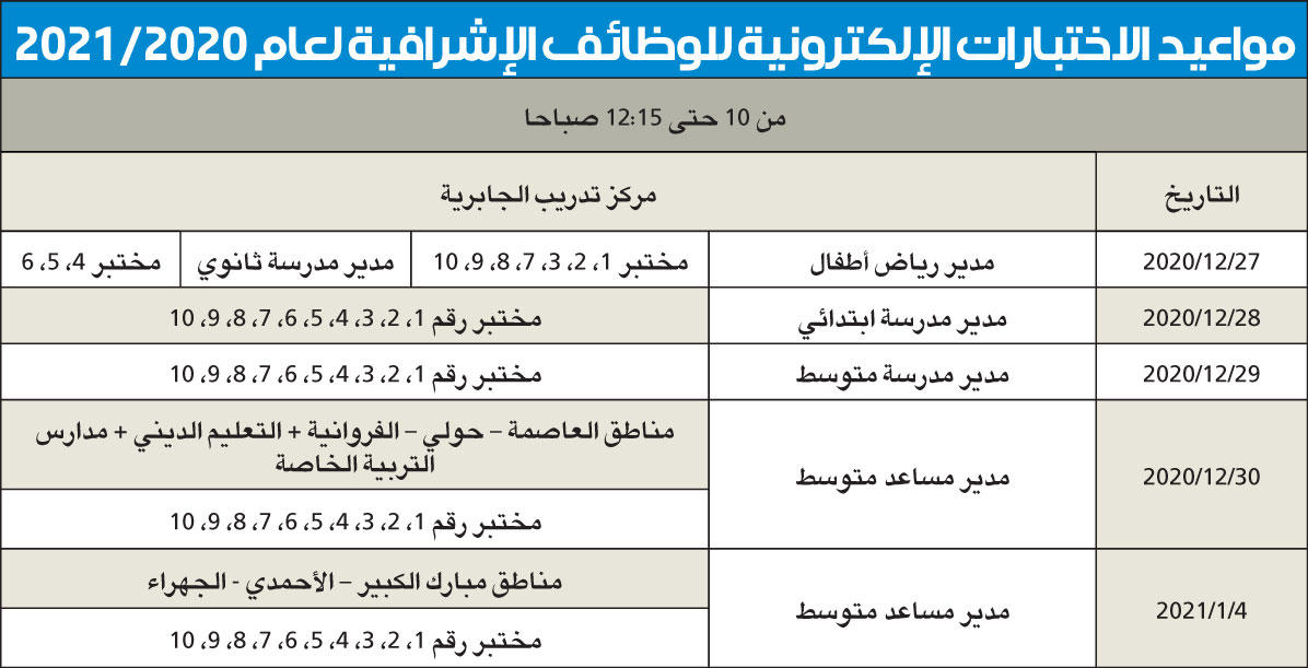 بموعد الاختبار وتاريخه، طبقاً للمراحل والمناطق التعليمية، آملا من الجميع الالتزام بالحضور قبل بدء الاختبار بوقت كاف، والالتزام بالاشتراطات الصحية".