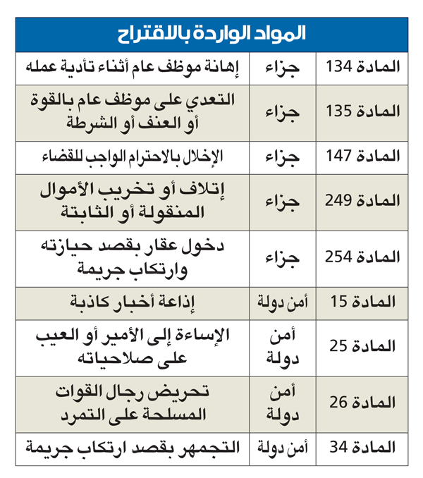 وأضاف الخليفة أن الاقتراحات تضمنت أيضاً «عدم رفع الرسوم والخدمات كالبنزين وغيره إلا بقانون، وقانون البدون بصيغة جمعية المحامين، وتعديل قانون الحبس الاحتياطي بالمخفر من أربعة أيام إلى 48 ساعة، وتخفيض مدة حبس النيابة من 21 إلى عشرة أيام».كما قدم النواب حمد المطر وفايز الجمهور وثامر السويط وعبدالعزيز الصقعبي وأسامة الشاهين اقتراحاً بقانون آخر، لكنهم لم ينشروا نسخة منه، في وقت دعا النائب صالح المطيري النواب للمشاركة في تقديم اقتراح مشابه، ليتمكن من تقديمه بصفة الاستعجال.وبالعودة إلى اقتراح الخليفة الذي زوّد «الجريدة» بنسخة منه، فإنه يطلب العفو عن المدانين في قضايا الرأي ودخول المجلس، إذ ينص على أنه «يعفى عفواً شاملاً عن الجرائم التالية التي وقعت خلال الفترة من تاريخ 16 نوفمبر 2011 حتى تاريخ 8 سبتمبر 2016، الجرائم المنصوص عليها في القانون رقم (16) لسنة 1960 في المواد (134، و135، و147، و249، و254) والجرائم المرتبطة بها، والجرائم المنصوص عليها في القانون رقم (31) لسنة 1970 في المواد (15، و25، و26، و34) والجرائم المرتبطة بها، والجرائم المنصوص عليها في المرسوم بقانون رقم (65) لسنة 1979 المشار إليه والجرائم المرتبطة بها».وقال النائب الجمهور عن الاقتراح الذي شارك في تقديمه: «تقدمنا باقتراح بقانون بشأن العفو الشامل مع بعض الإخوة النواب الأفاضل، ونتمنى تعاون الحكومة في إقراره، لإرجاع أبنائنا وإخواننا لبلدهم وأهاليهم، وتقر الأعين بهم».